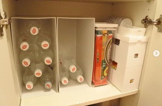 こちらはダイソーのファイルボックスに炭酸水を収納している例です。横向きに収納すると、取り出しやすそうですね。パントリー収納もすっきり見えます。