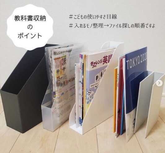 ファイルボックスはやはり教科書収納に最適です。100均にはいろいろな種類のファイルボックスがありますが、使う人や使う場所、入れるものに合わせて選びたいですね。