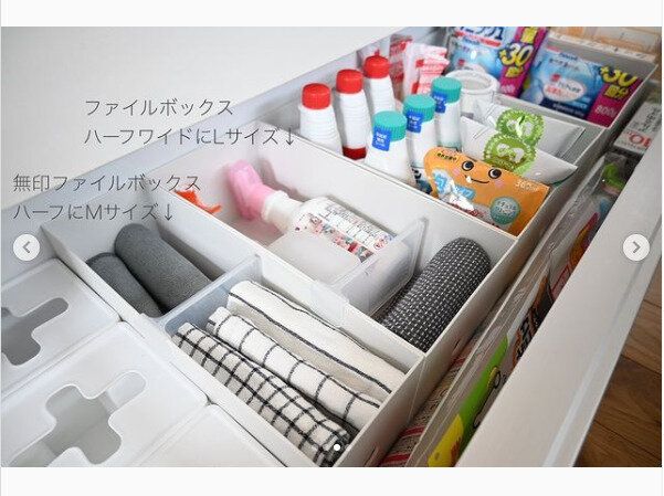ファイルボックスに用途別にラベリングをすることで、使いやすく、スッキリ整理された空間が長続きします。ハーフサイズにすることで、何が入っているか一目でわかるので、ストック量もわかり、無駄な出費も防げます。