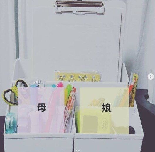 ファイルなどの紙類をまとめるボックスは文房具の収納にも使えます。親子で違う文房具を使う場合、使う人ごとに分けるのもよいアイデアですね。