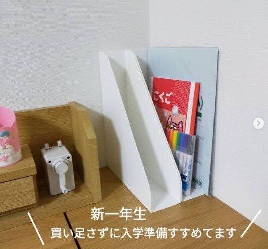 小学校のお子さんの教科書収納には、セリアのA4ファイルスタンドがおすすめです。立ち上がり部分がないので、教科書の出し入れがしやすく、片づけが苦手なお子さんでもリバウンドすることなく学校の準備ができます。