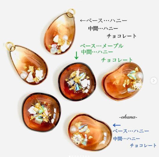 こちらはキャンドゥのレジンを使ったべっ甲風の作品。ハニーやチョコレート、メープルなどの色を組み合わせ、いくつかの種類をつくっているそうです。それぞれ色合いが若干異なり、きれいにできていますね。