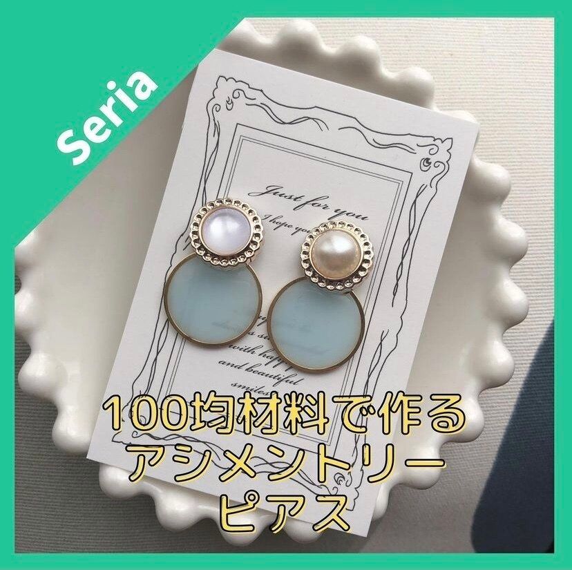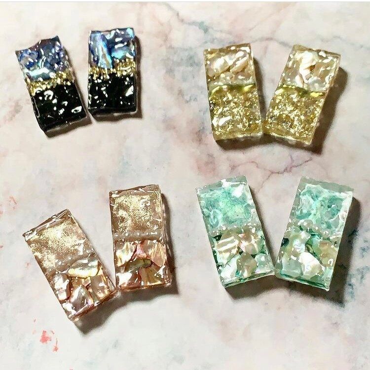 こちらも100均のアイテムでつくるレジンピアスです。お店で販売されているようなクオリティのピアスですが、パーツにレジンを流し込んで、パーツをつければ完成します。とっても簡単なのに高クオリティなピアスです。