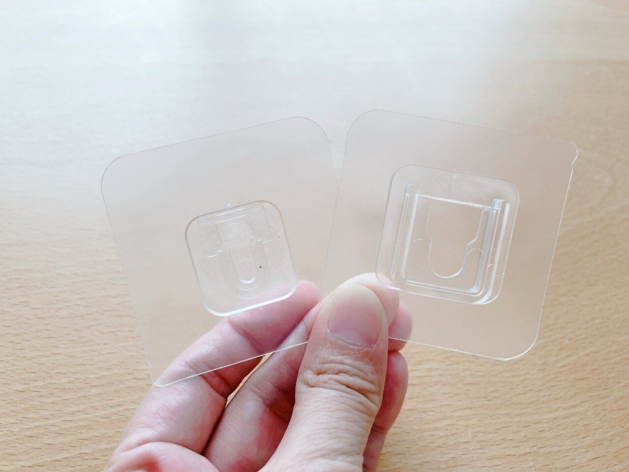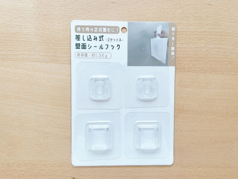 2セット入りで耐荷重は1セットあたり約1.5kg。シールフックは凹型と凸型があり、2つを組み合わせて収納するアイテムです。凸型のフックが下を向くようにすると、ピタッとはまりこみます。