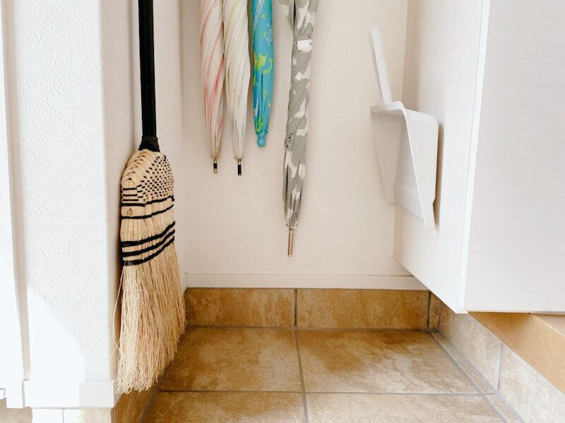 我が家では1セットは、玄関でちりとりを浮かし収納するのに使っています。元々は土間に収納していたちりとりですが、使った後砂ホコリが棚に付着するのが気になっていました。そこでちりとりに凸型、靴箱の横に凹型のシールフックをセットしてほうきと対面収納に!