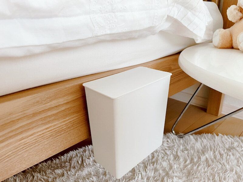 凹型フックをベッドサイド、凸型フックをゴミ箱に貼り付けてセット。ゴミ箱の重さが1.2kgなのでフック1セットで十分。上に引き上げればゴミ箱を取り外せるので、ゴミを捨てる時も簡単です。