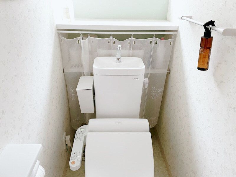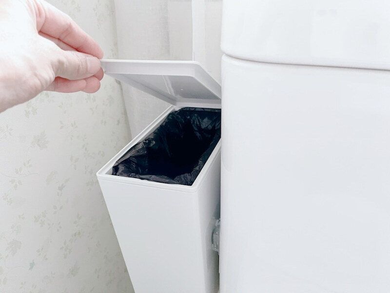 子どもたちの生理が始まったこともあり、トイレのゴミ箱を大きめサイズに変更。またカーテン閉め忘れ問題を解決するために、サニタリーボックス(ゴミ箱)をトイレタンクの側面に設置することに!