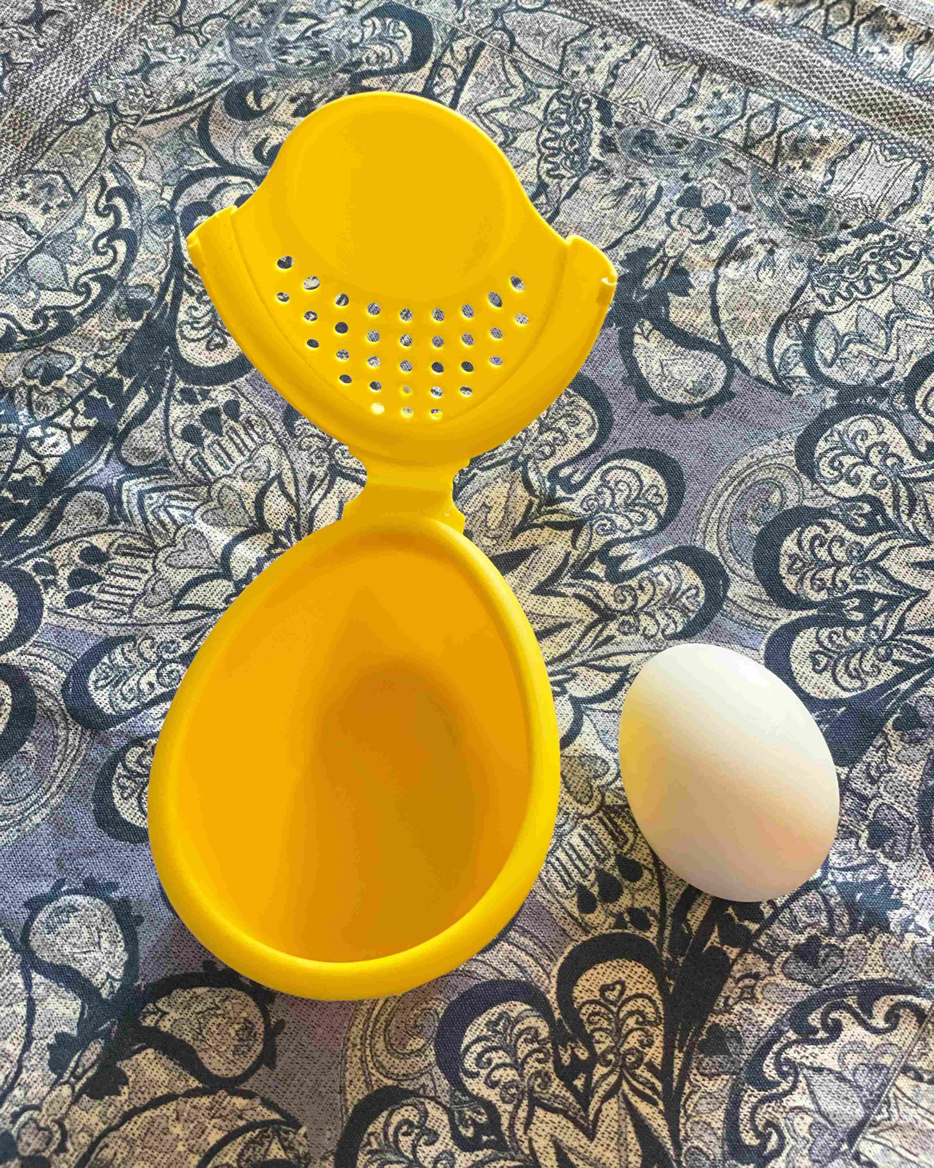 蓋がパカっとあき、湯切りの穴も付いています。卵と比較すると、2倍くらいの大きさ。