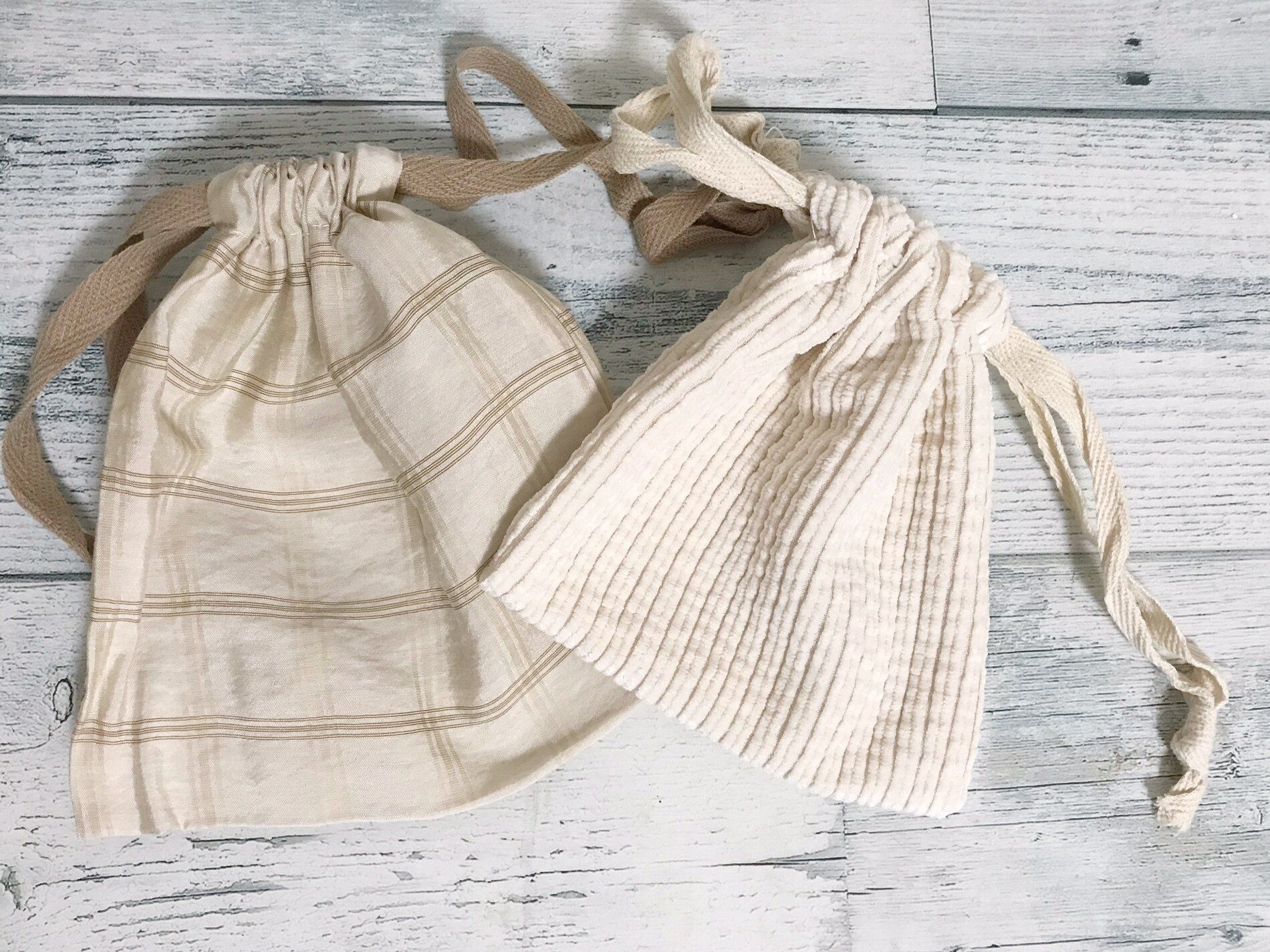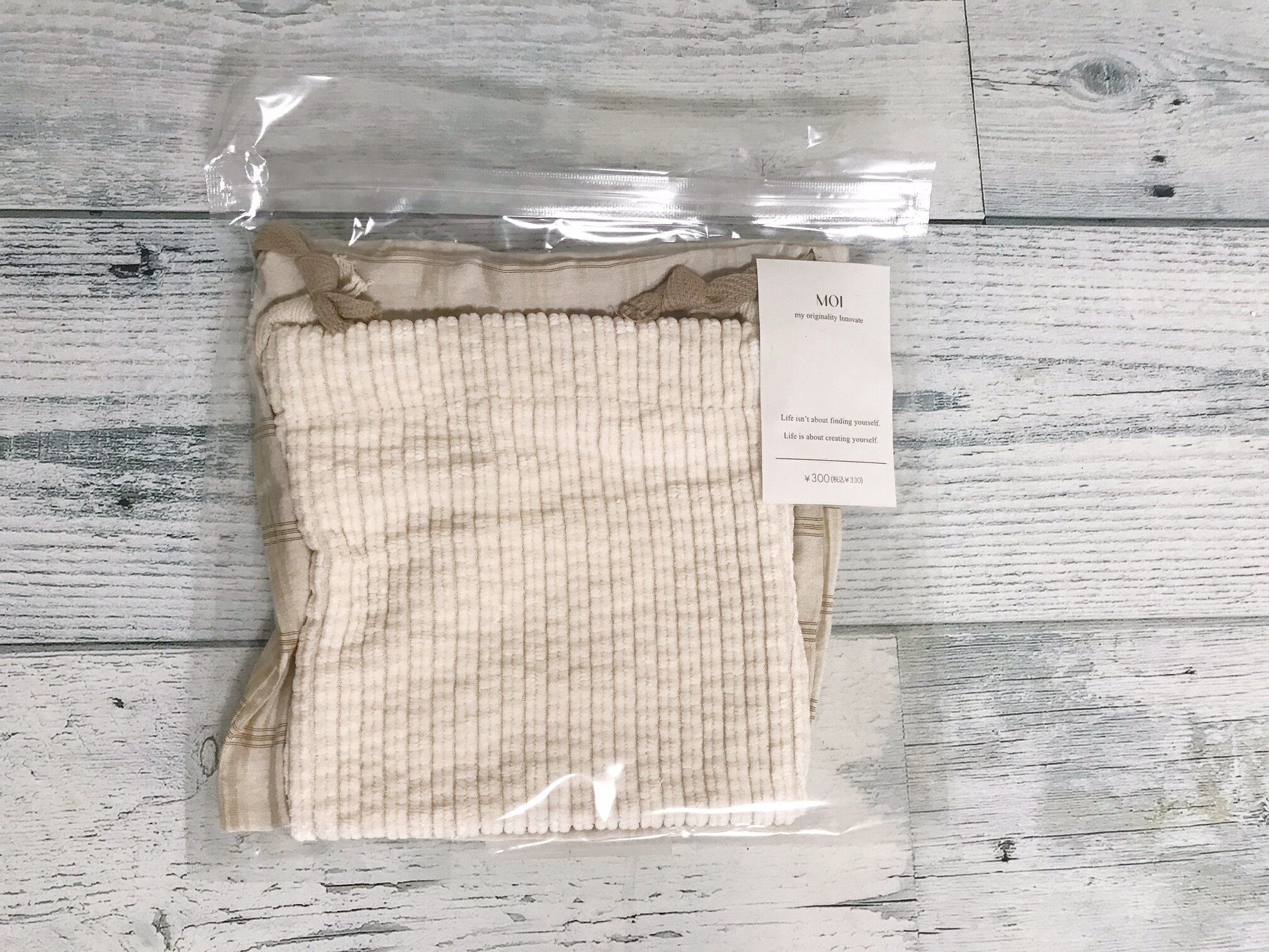 「チェックコーデュロイ巾着2個セット」(330円)は、小さめの巾着が2個セットで販売されています。筆者が購入したのはアイボリー/ホワイト。他にもマスタード/パープル・ピンク/グリーン・グリーン/オレンジの全4種類展開で販売されています。