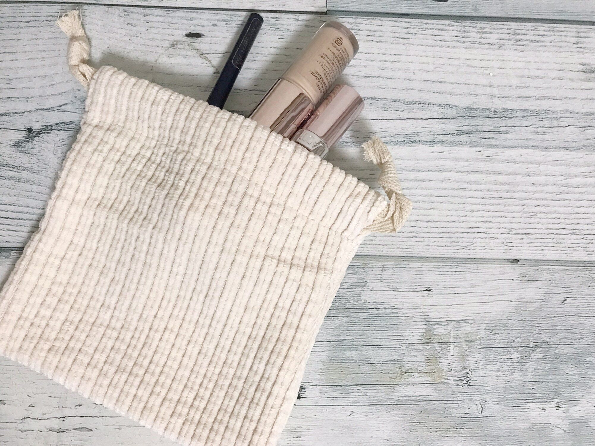 この巾着のおすすめのポイントは、小さめサイズという点。コーデュロイの巾着は、約横13cm×縦11cm(紐部分除く)。お直し用のリップやアイライナーなどコンパクトなコスメを1つにまとめられるのでかさばりにくく、かばんの中がごちゃごちゃしません。ポーチが大きすぎるとかばんがいっぱいになってしまいますが、巾着自体が小さいのでとても使い勝手が良いです。アクセサリーなどを入れるのにもおすすめです。