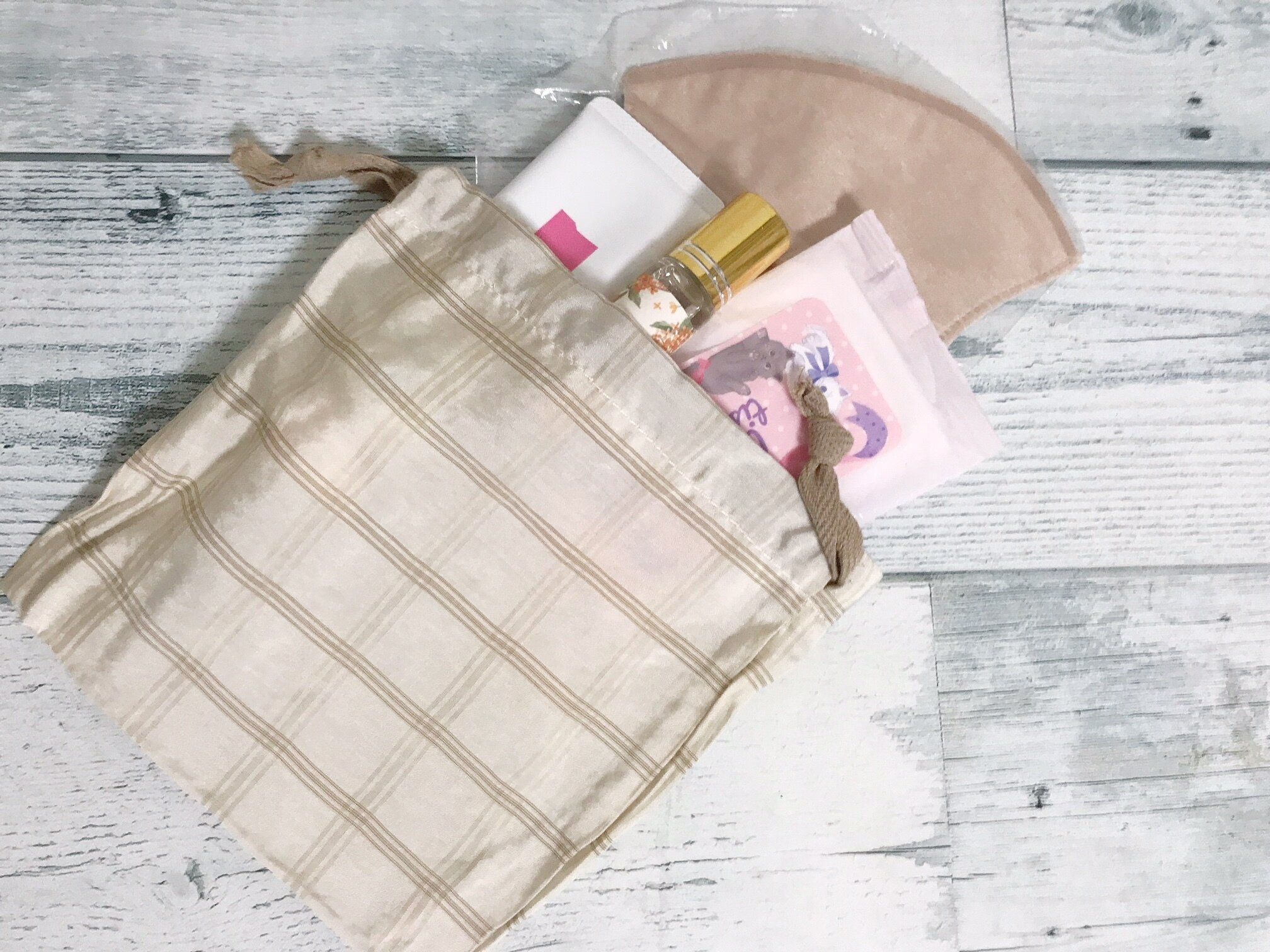 チェック柄の巾着は、約横16cm×縦15.5cm(紐部分除く)。コーデュロイの巾着より少し大きいサイズ感なので、ハンドクリームや予備のマスクなども収納可能です。サニタリーアイテムを持ち歩くのにもちょうどよいサイズ感。女性なら持っていて重宝する事間違いなしです。