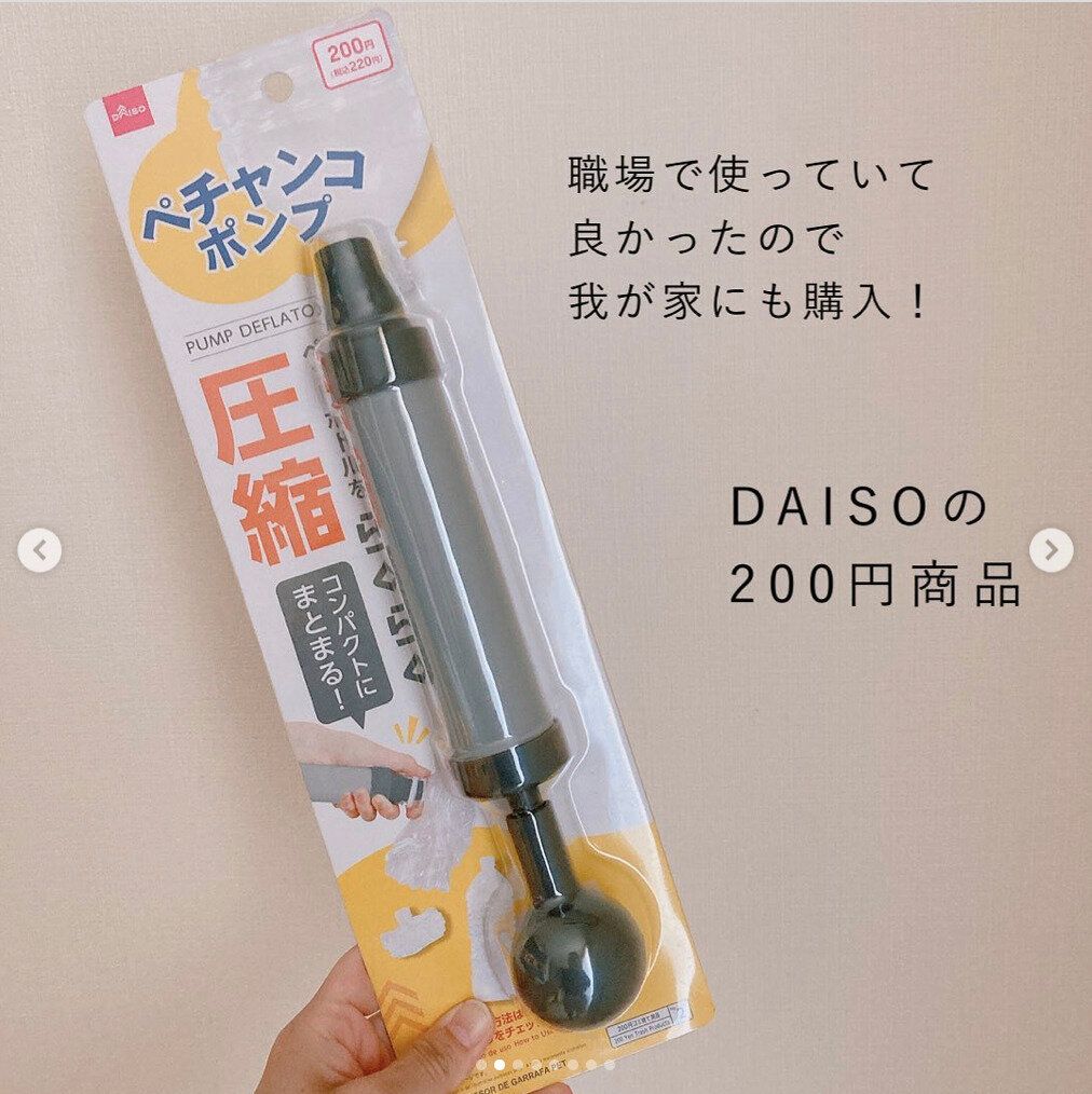 ペットボトルをゴミに出すとき、とにかくカサを減らしたいですよね。手や足でがんばって潰してもいいのですが、ダイソーにはこんな便利アイテムがあります!220円で買える、その名も「ペチャンコポンプ」なら、中の空気を抜くことでペットボトルをペチャンコにしてくれますよ。