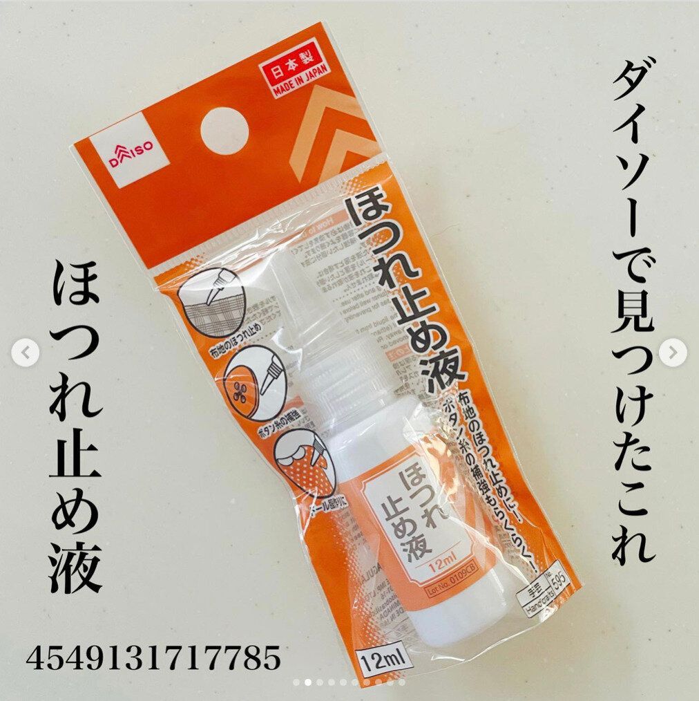 布地のほつれ止めやボタン糸の補強に、さっと塗って乾かすだけ!ダイソーで買えるほつれ止め液はいざという時のために1つ持っておきたいアイテムです。フタを開けると先の細いノズルが出てくるので、塗りたい部分にピンポイントで直接塗ることができます。不器用さんでも簡単です!