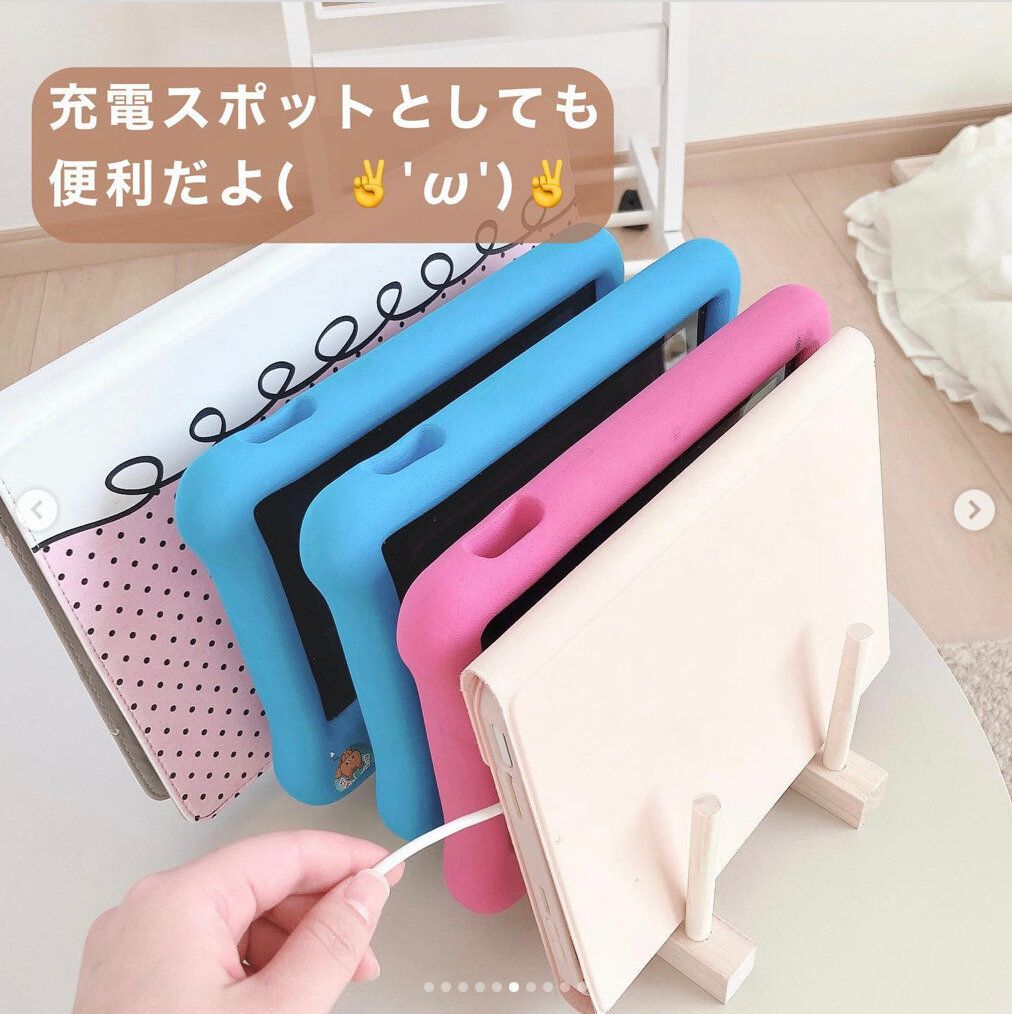 おしゃれで見せる収納にも人気な、ダイソーの木製お皿立て。実はこんな使い方もできるんです。リビングにタブレットがたくさん転がっているおうちでは、こんな風にタブレット置き場として使ってみてはいかがでしょうか?そのまま充電もできるのがとても便利ですね。子どもたちも自分でお片づけするようになるかも!