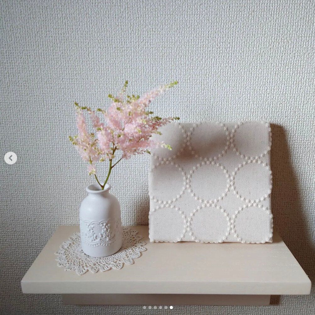 ディスプレイされているフラワーベース、100均には見えませんよね!?こちらはセリアにて、110円で買えるフラワーベースです。とてもシンプルなホワイトの陶器に、フラワー柄のエンボスの陰影が映えますね。デコラティブだけどとても優しい印象です。生花を飾っても、ドライフラワーを飾ってもいいですね。