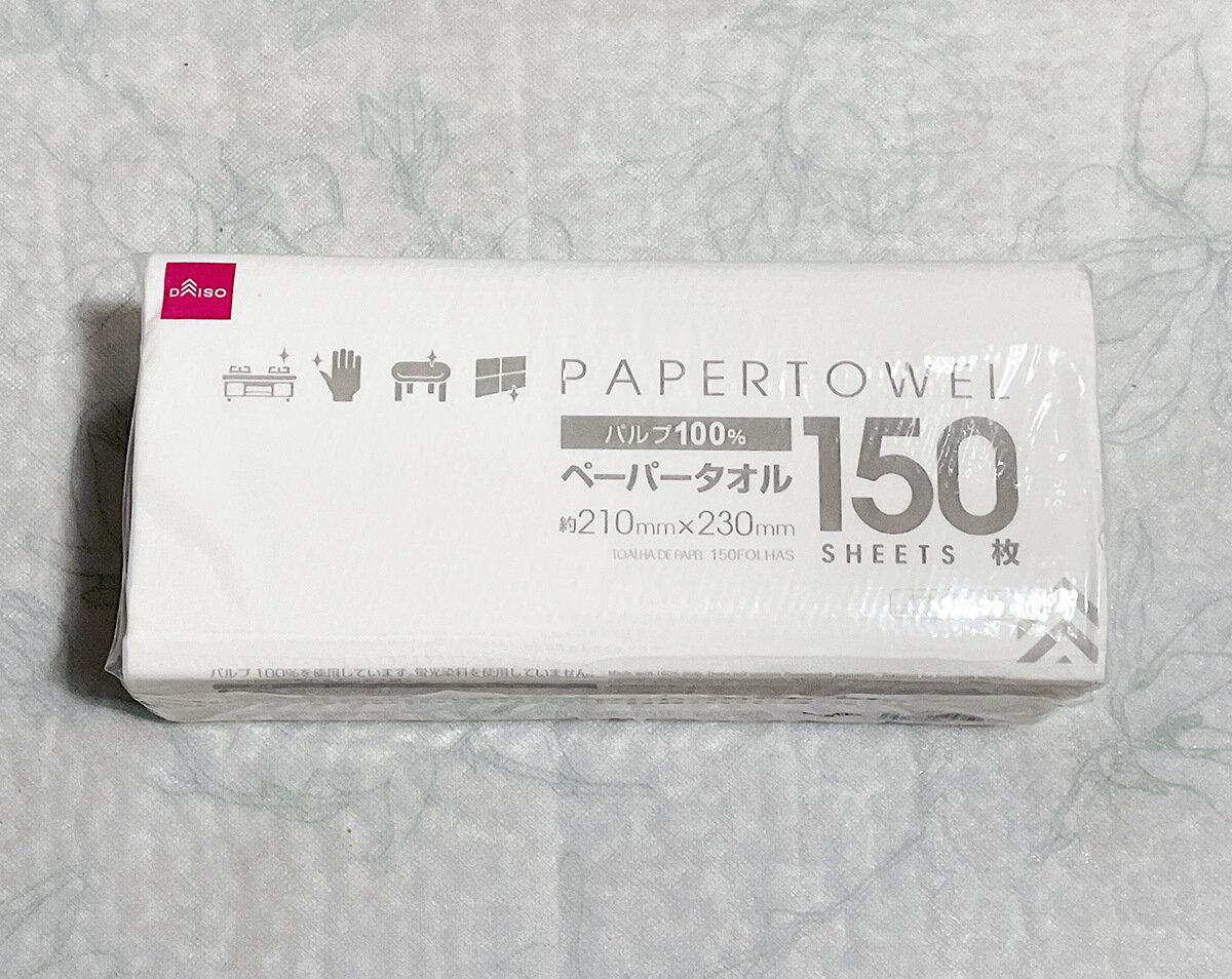 もっとたくさん入っていて安いものもありますが、手を拭くには硬すぎてしまうと感じていて、その点ダイソーのものは適度にやわらかさもあるのでベスト。