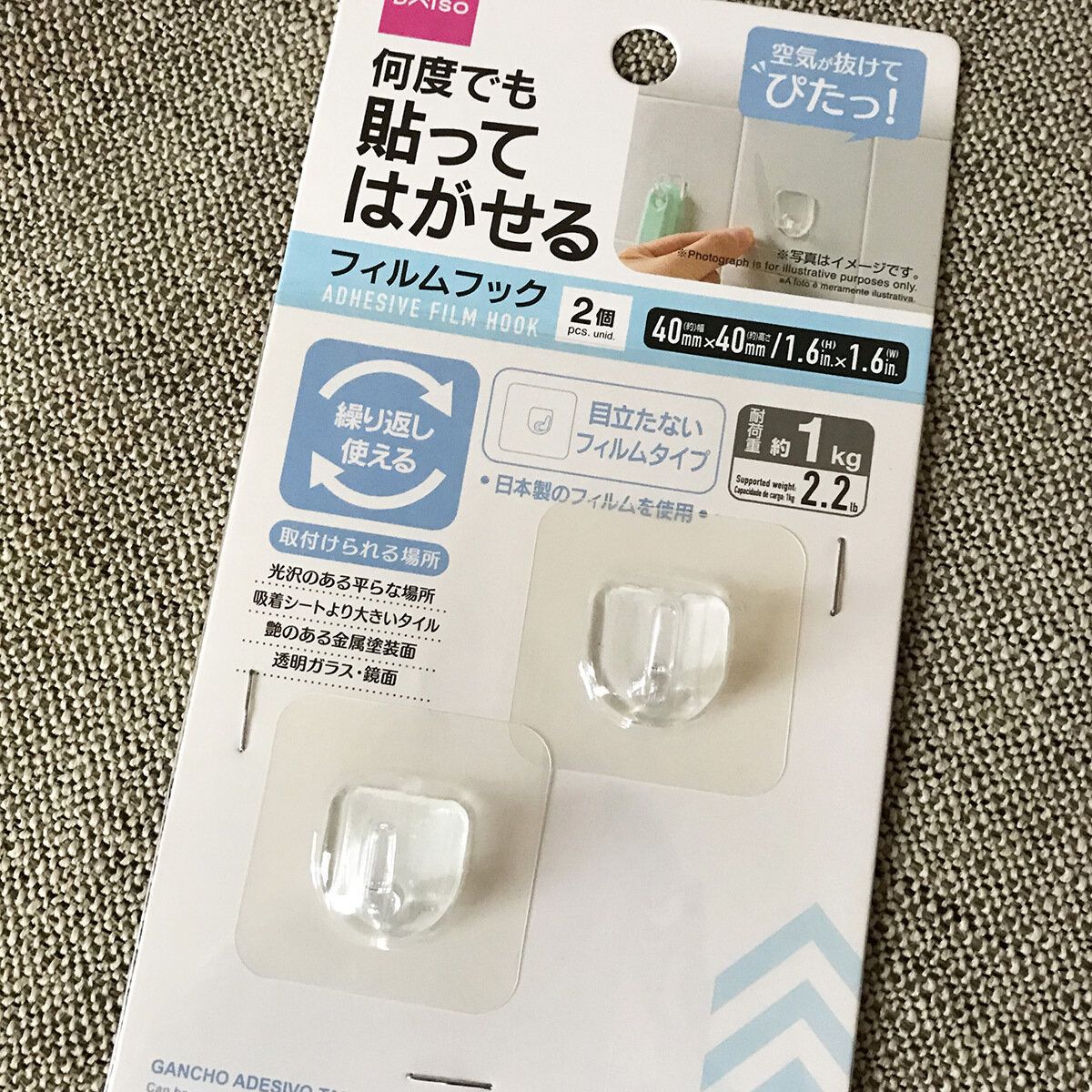 フィルムフックを壁につけて、ケースの穴をかけるようにしています。