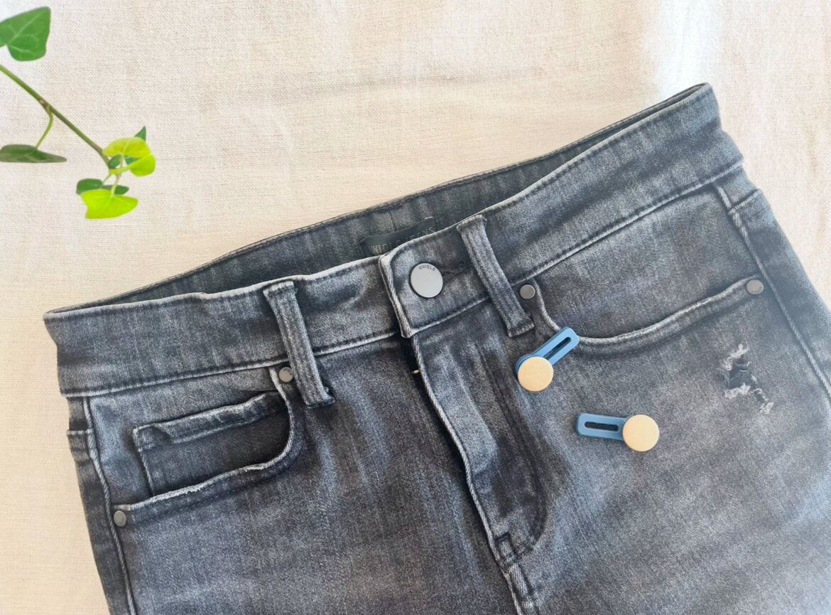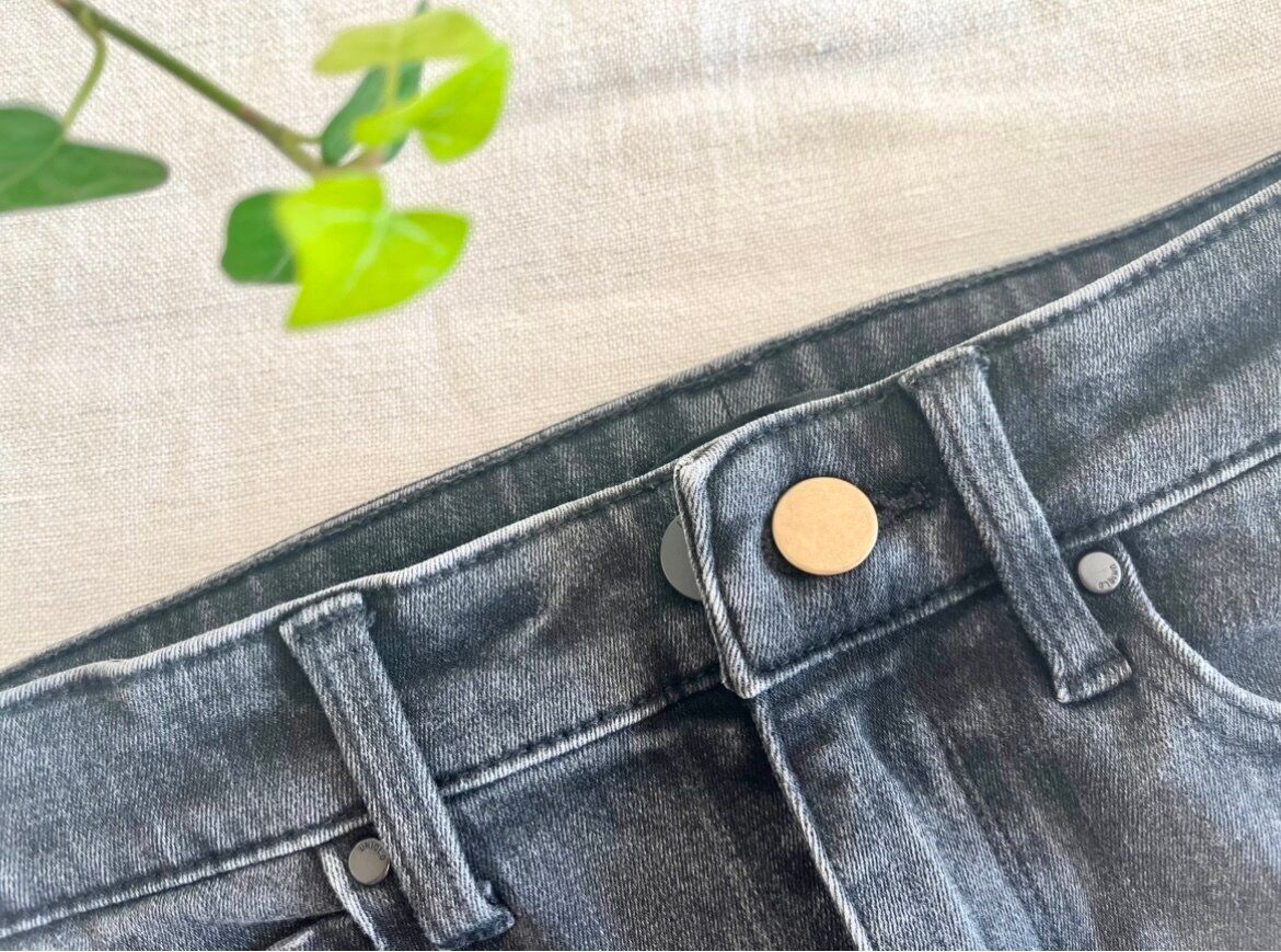 ボタンがゴールドカラーなので高見え!また、延長バンドが青色なので、青いデニムならほとんどつけているのかわかりません。ただやっぱりボタンが2つ見えてしまうと少し違和感があるので、トップスで隠してしまう方がいいかと思います。