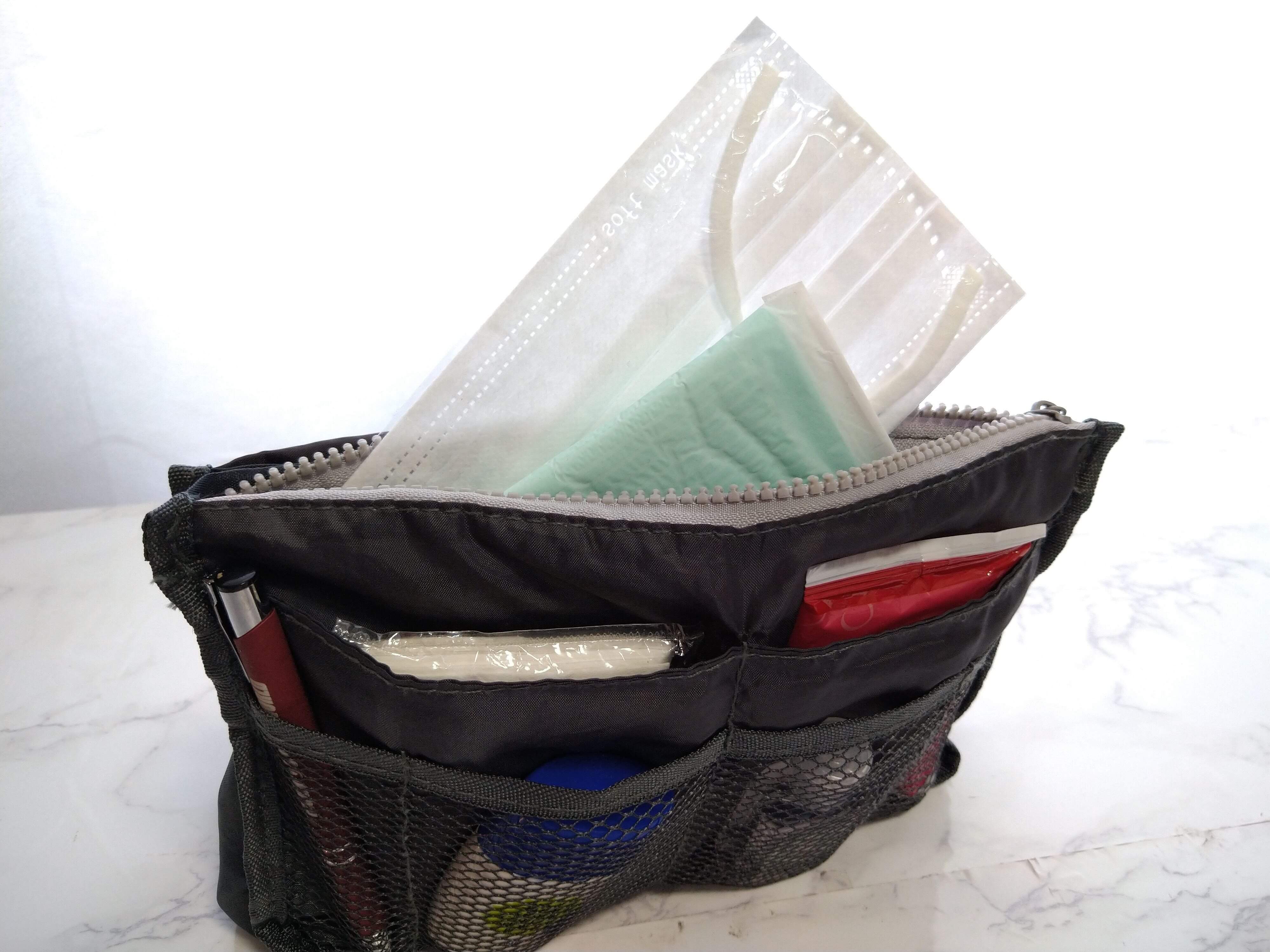 通帳などの貴重品やバッグを開いた時に見えたくないものをしまうのに便利です。私は予備のマスクやナプキンなど衛生上分けたいものを入れています。