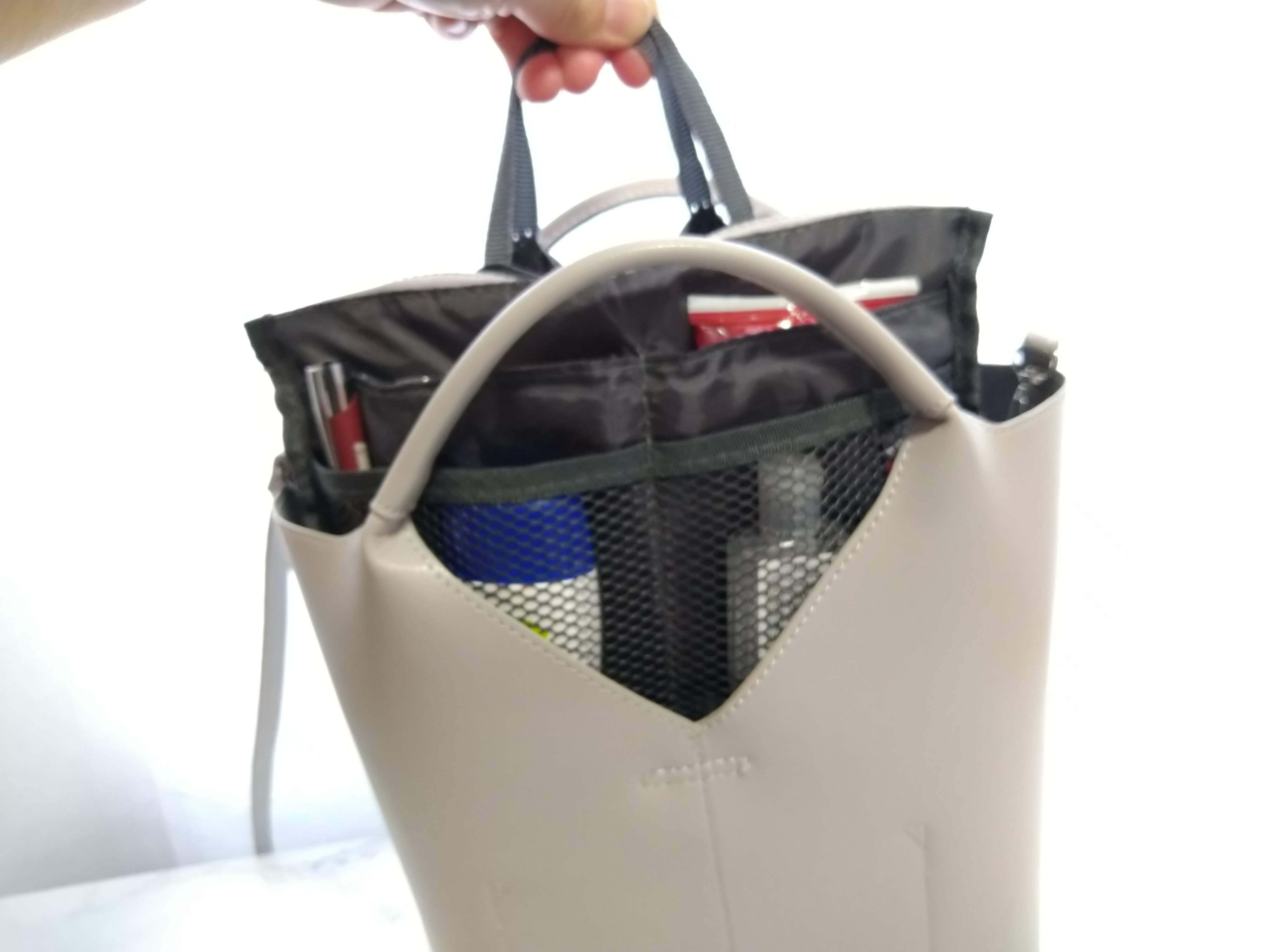 このバッグインバッグを使えば、ボールペンやリップクリーム1本まで取り出しやすい「立てる収納」が叶います。ものをワンアクションで取り出せ、見つからないあのイライラから解消されるのです。
