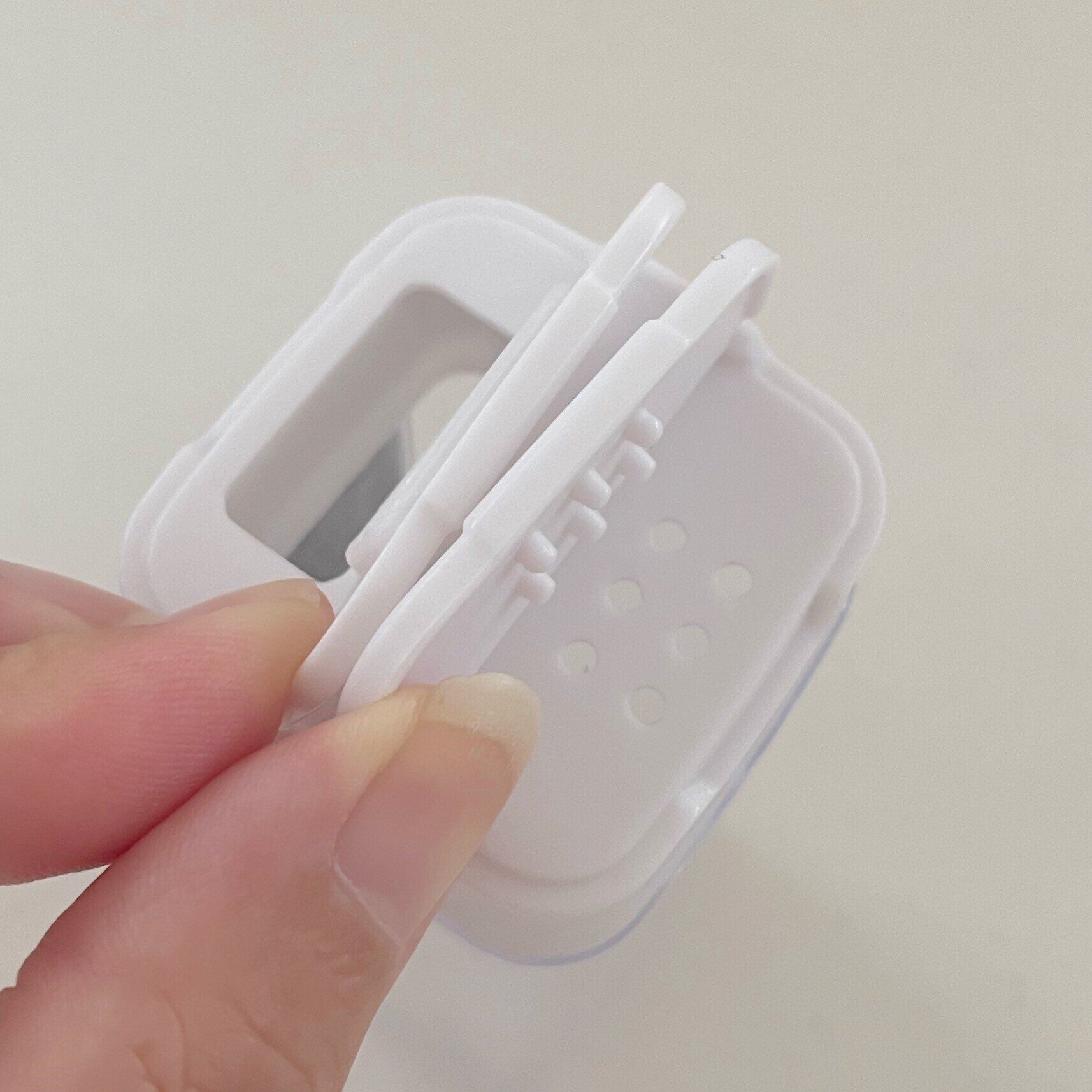 ストッカーは持ち手つきで貼りつけた場所から片手で取り出し可能なうえ、フタ部分のつまみを親指で押すとフタがスムーズに開閉します。