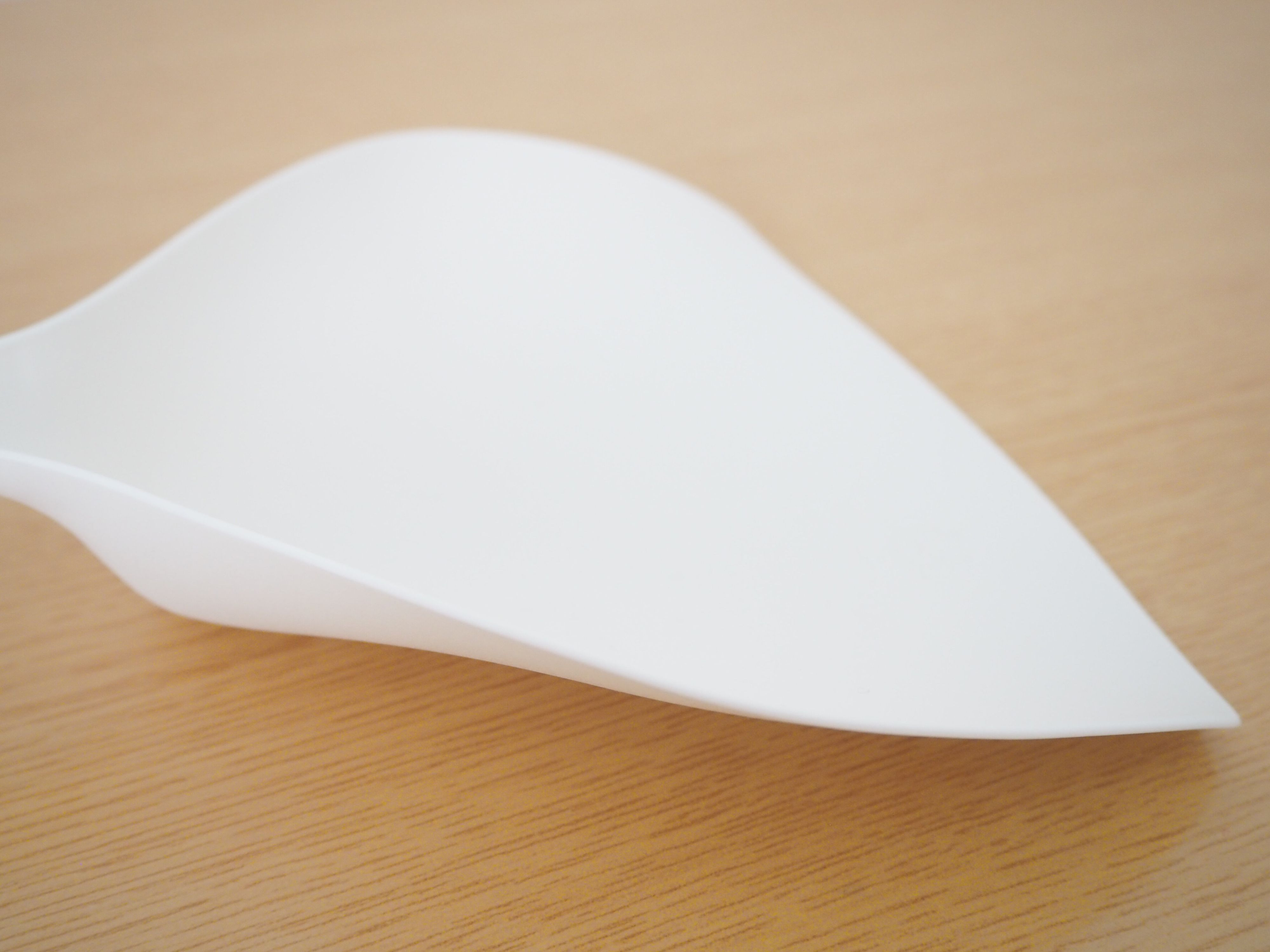 では特徴を見ていきます。チリトリは流線状になっているのがポイント。ブラシをあてたときに突っかかりづらく、ゴミを集めやすそうな見た目です。約1mmという厚さなので、床にフィットしやすいのも特徴です。