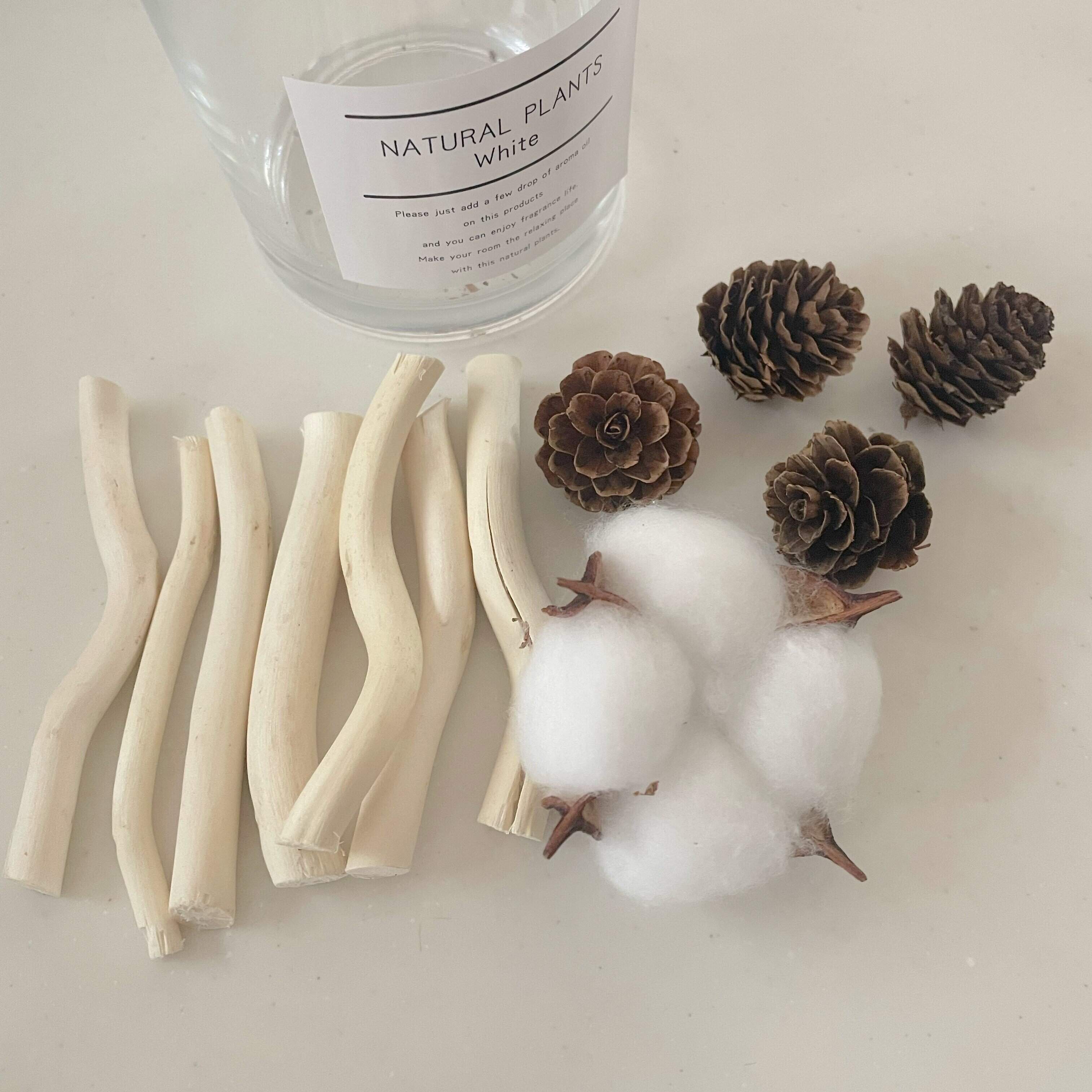 重めのガラス容器に入っているのは白木・コットンプランツ・まつぼっくりです。