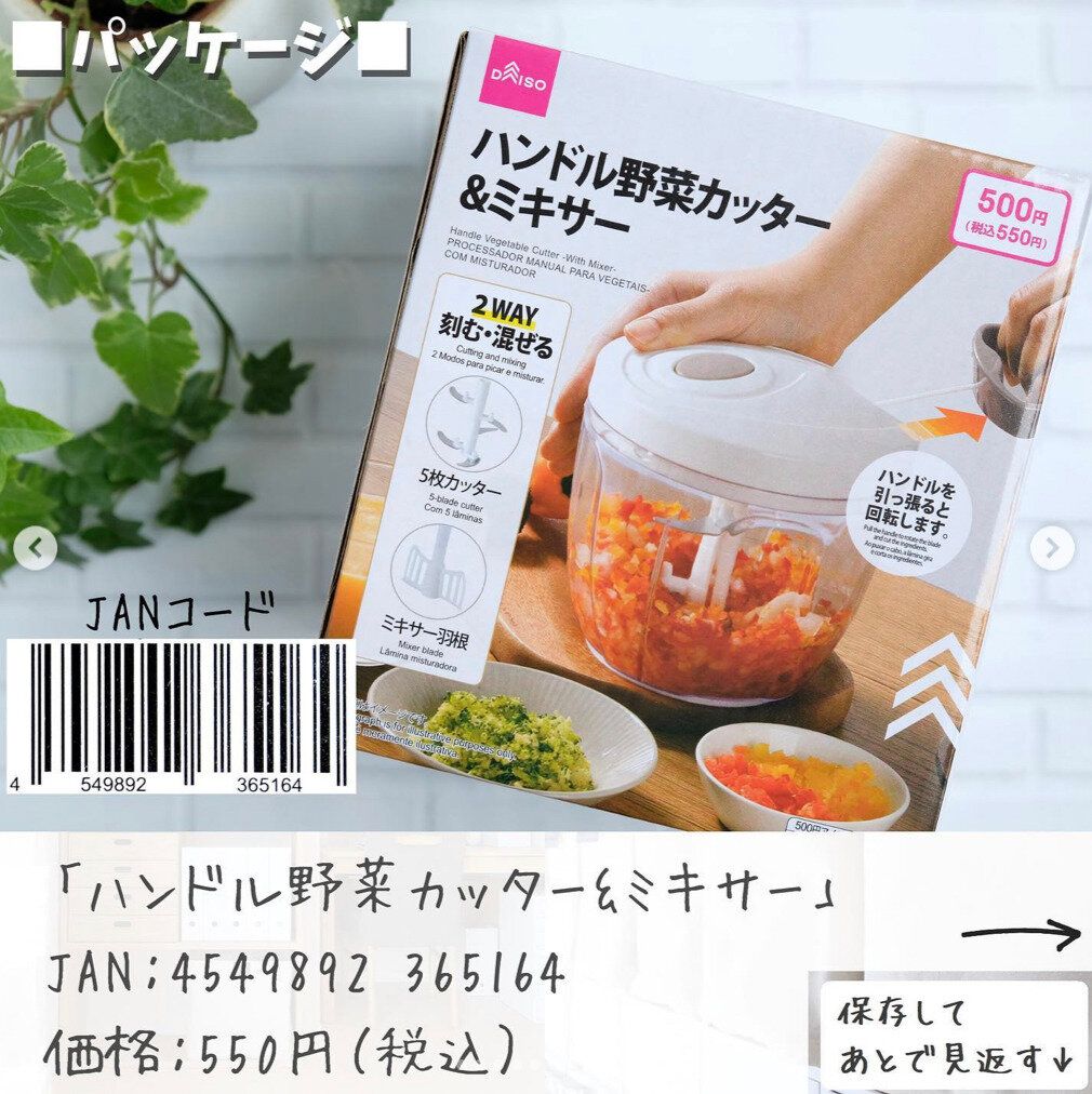 野菜が簡単に刻める野菜カッター、ダイソーの新商品はなんとミキサー機能がついているんです!ドレッシングづくりやメレンゲづくりなど、ちょっとだけミキサーを使いときに便利ですね。洗うパーツは4つでお手入れも簡単!既存品の3枚刃タイプと比べて、5枚刃になって切れ味もアップしています。550円です。