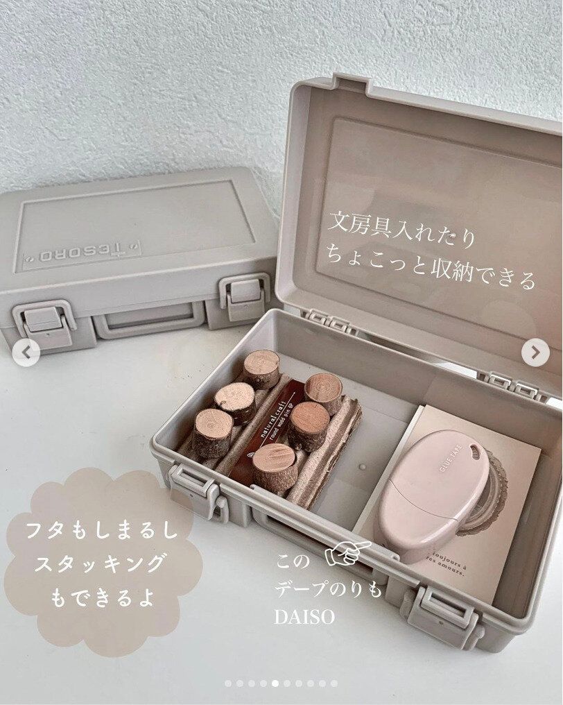 インテリアになじむグレージュカラーがかなりツボなこちらは、工具箱(テソロケース)風のミニ収納ボックスです。取手とバックルがついているのでちょっとした持ち運びにも便利!スタッキングもできますよ。文房具やメイクグッズなどを入れるのにちょうどいいサイズです。