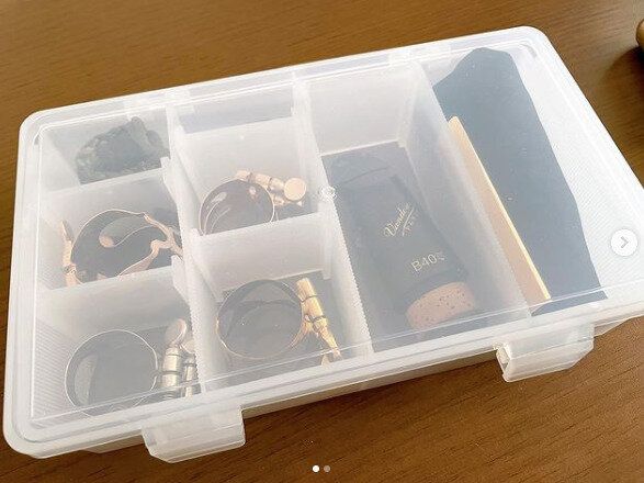 こちらは、クラリネットのマウスピースなど、楽器の細かいものをダイソーの収納ケースに入れている例です。仕切りがついているので、とてもスッキリキレイに収納できます。半透明でわかりやすいのもおすすめポイントです。