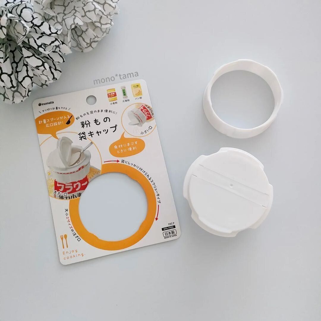 小麦粉やパン粉、片栗粉などの粉類を購入したときに、わざわざ保存容器に入れ替えるのが面倒…と感じた経験はありませんか?そんなときにおすすめなのが、「粉もの袋キャップ」。その名のとおり、袋に入った粉類をそのまま保管できるすぐれものです。リングとパーツがついており、入り口にそのままはめるだけ!注ぎ口も大小両方のサイズが用意されているため、使いやすくなっていますよ。