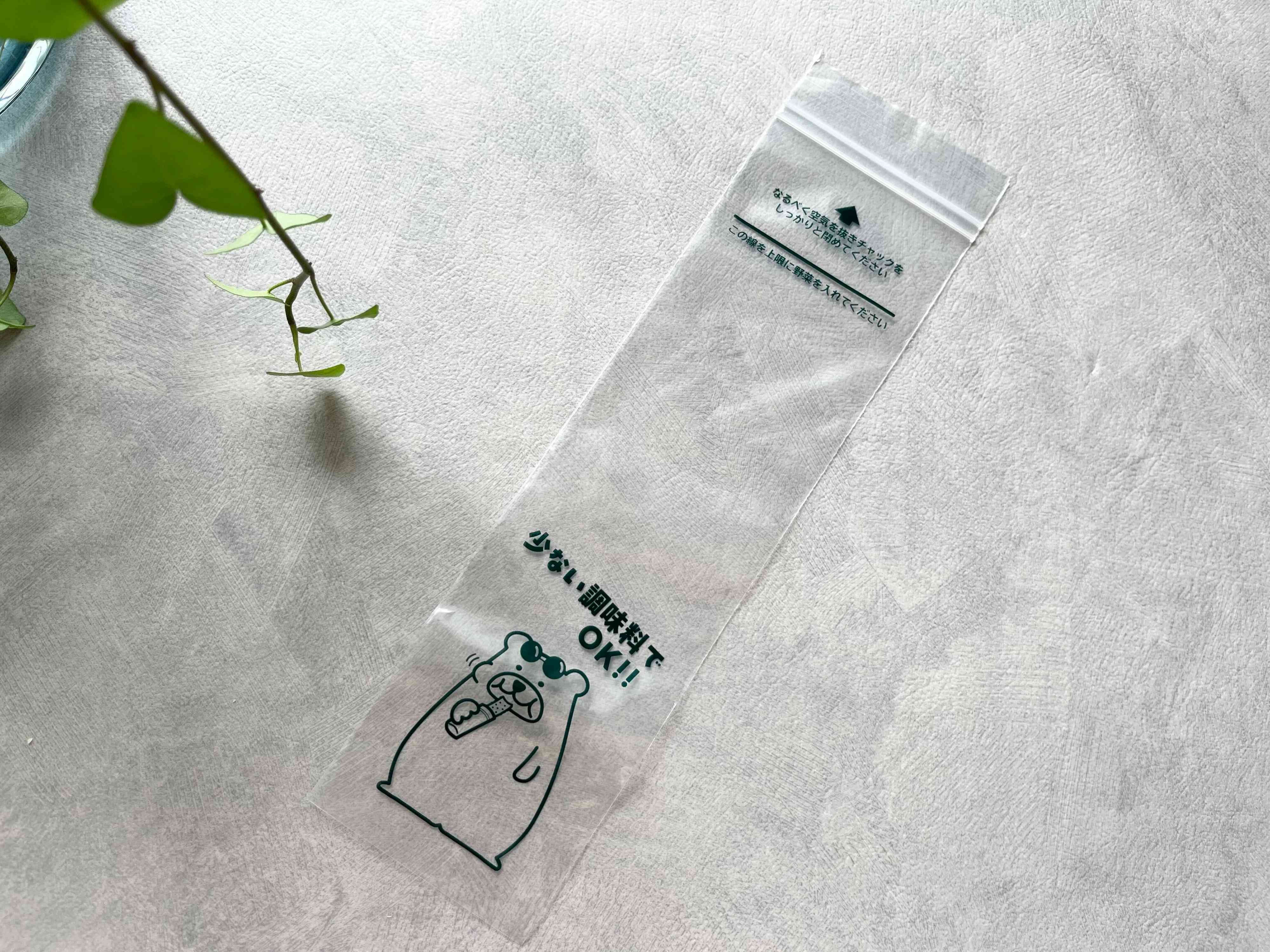 こちらの商品は、可愛らしいくまさんのイラストが描かれた縦長のチャック付きの袋です。浅漬け専用の使い捨ての袋で、商品サイズは約6.5cm×22cm×0.004cm。できるだけ少ない量の調味料で浅漬けが作れるように、野菜を入れた時に周りに余白ができにくいようにかなり細めのデザインになっているのが特徴です。