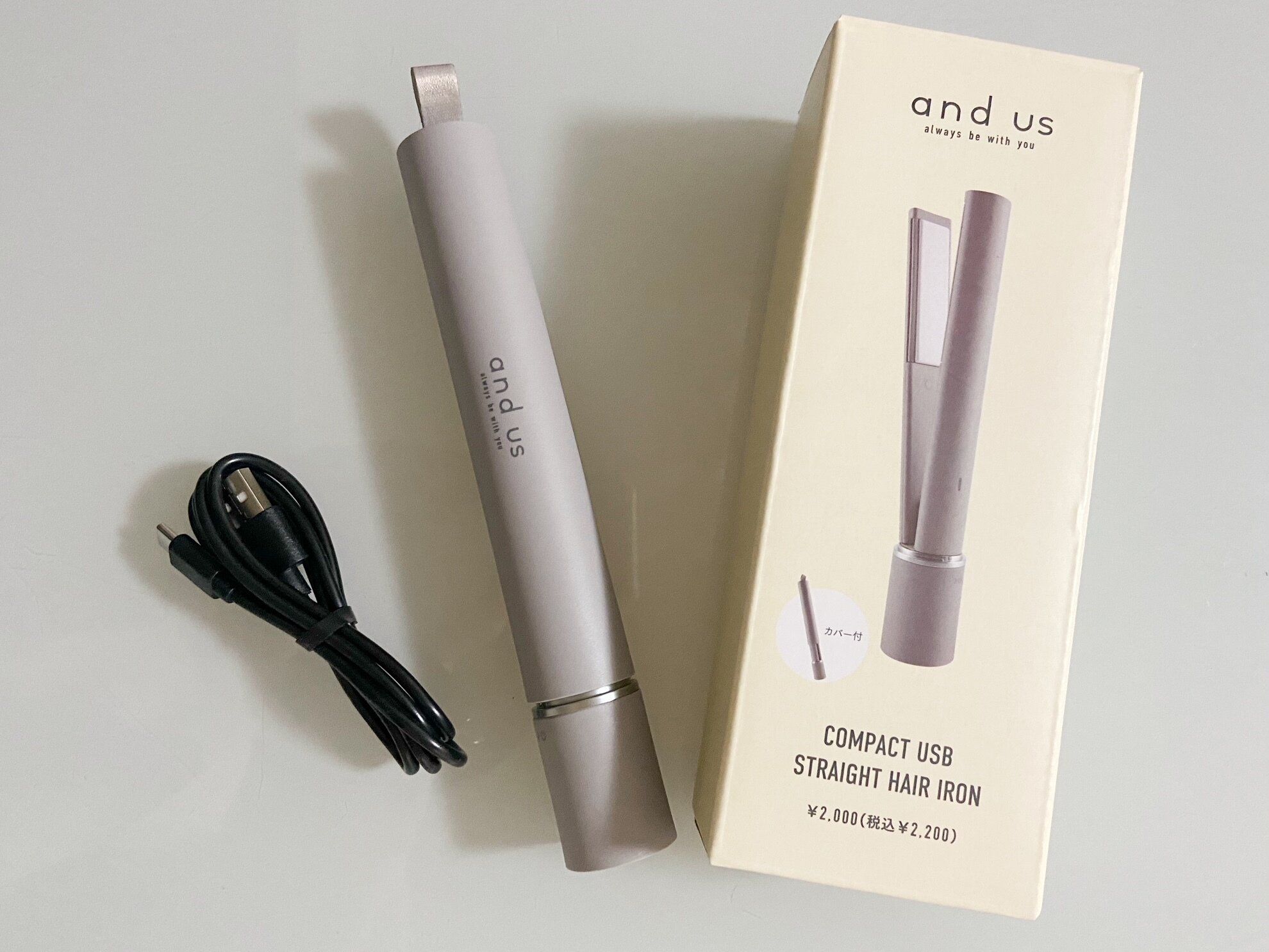 今回ご紹介するアイテムは「【and us】コンパクト収納USBストレートアイロン」(2,200円)です。人気主婦YouTuberほしのこさんも3COINSの購入品として紹介していた大人気アイテム。セット内容は・本体・カバー・USBコード・取り扱い説明書となっています。USB接続式ACアダプター、またはモバイルバッテリーに接続して使用するタイプのストレートアイロンです。ちなみに充電式ではありません。