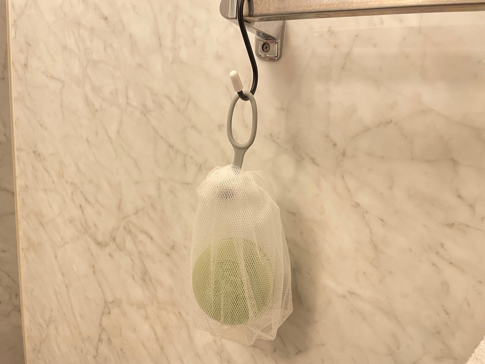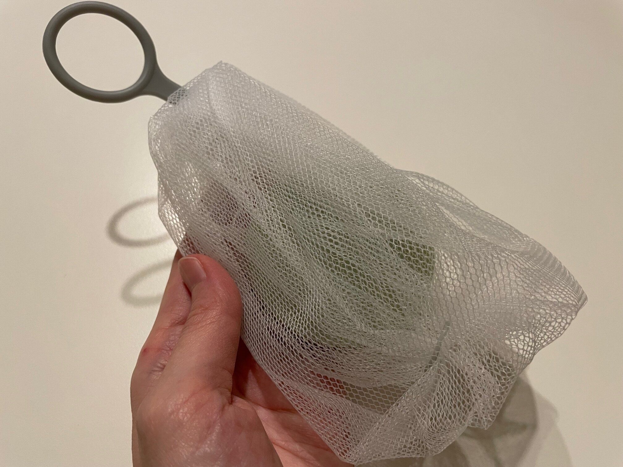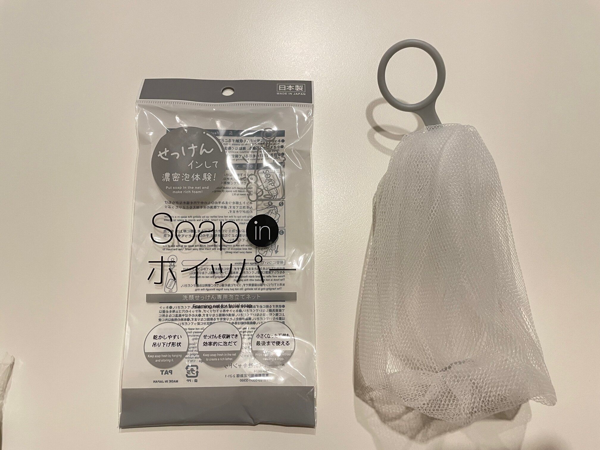 ネットの下がゴムで伸縮するようになっていて、固形石鹸を入れることができます。
