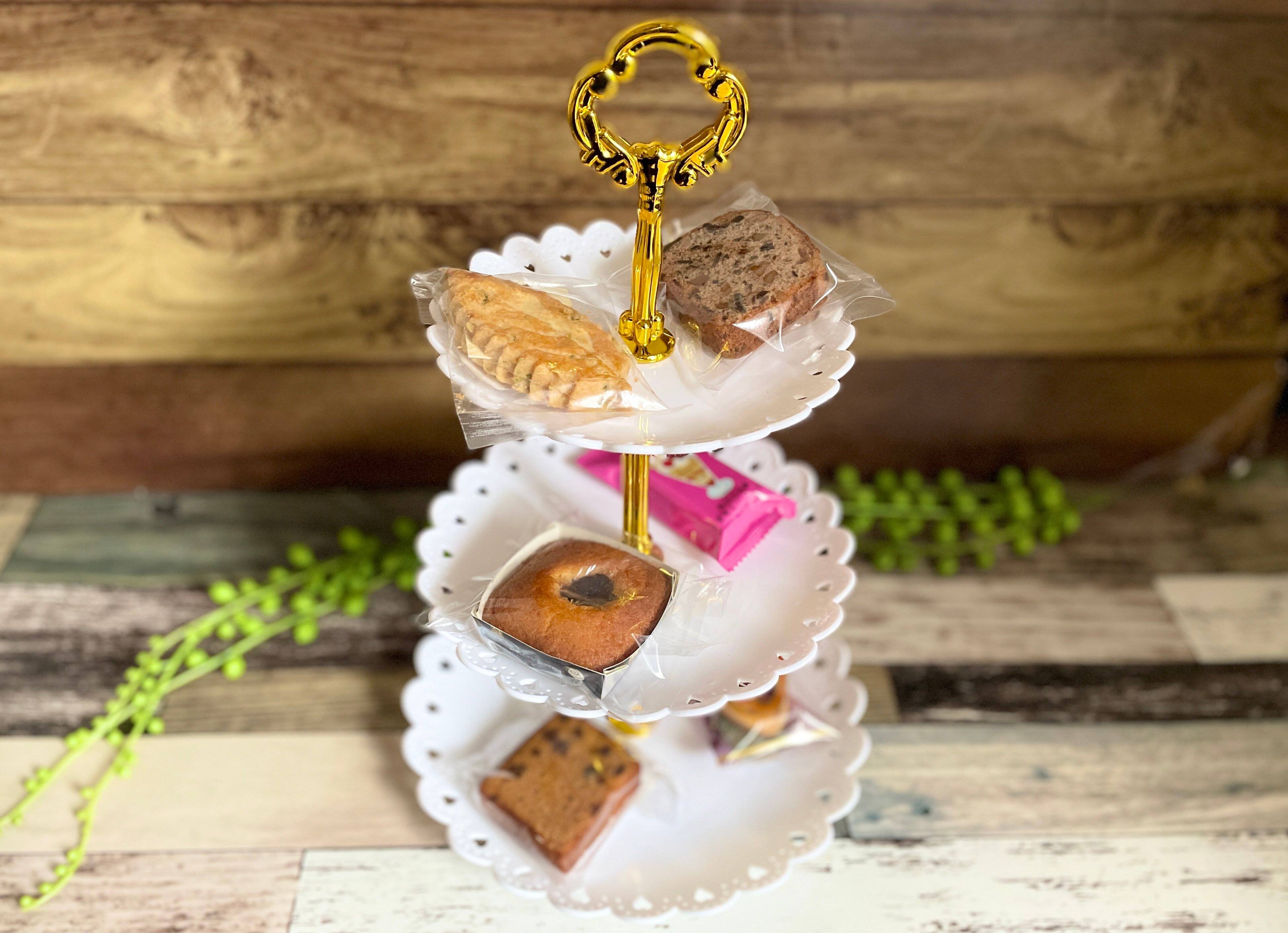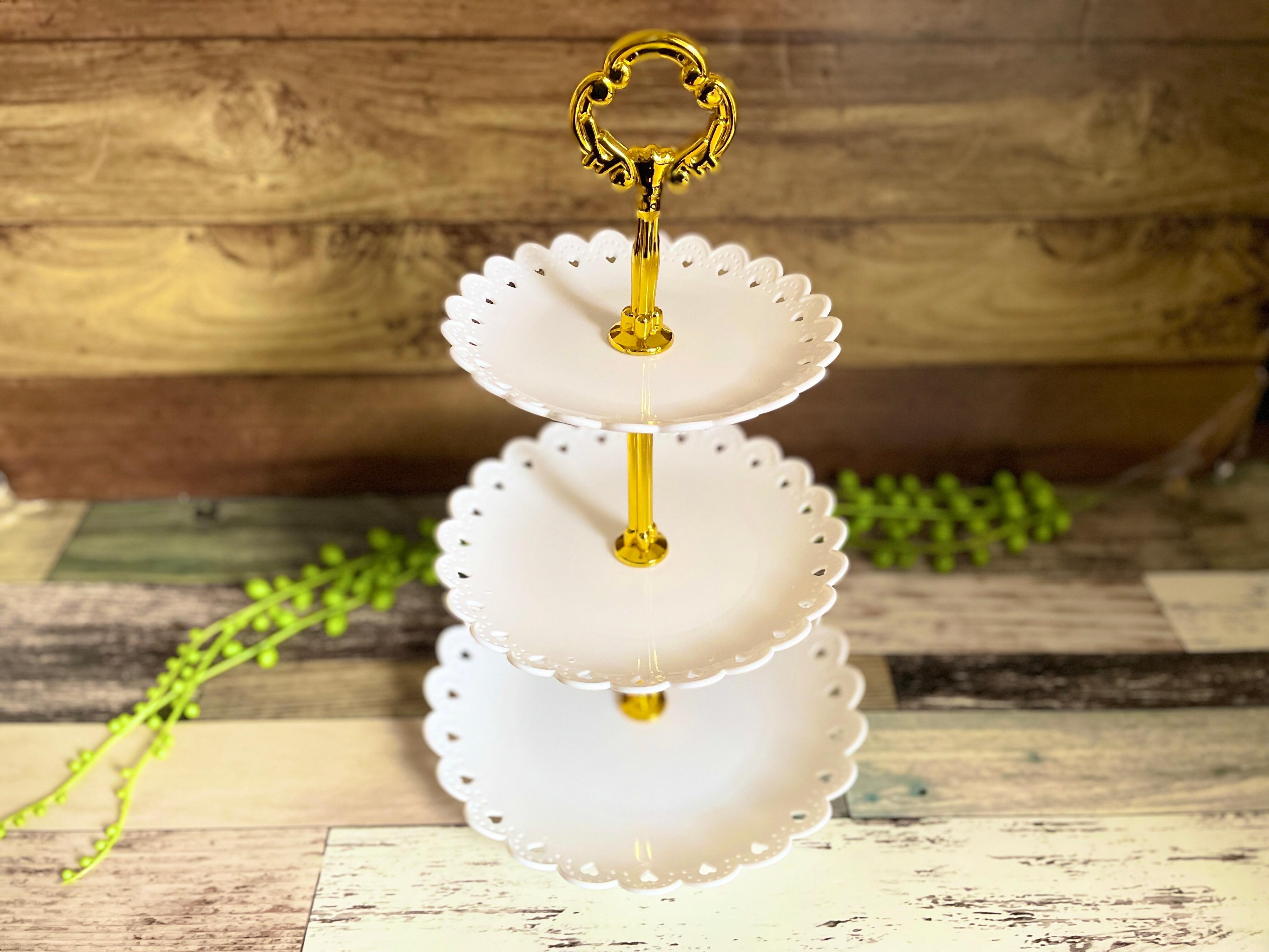 レースのような模様の白いお皿と、ゴールドのパーツが素敵な3段のケーキスタンド。