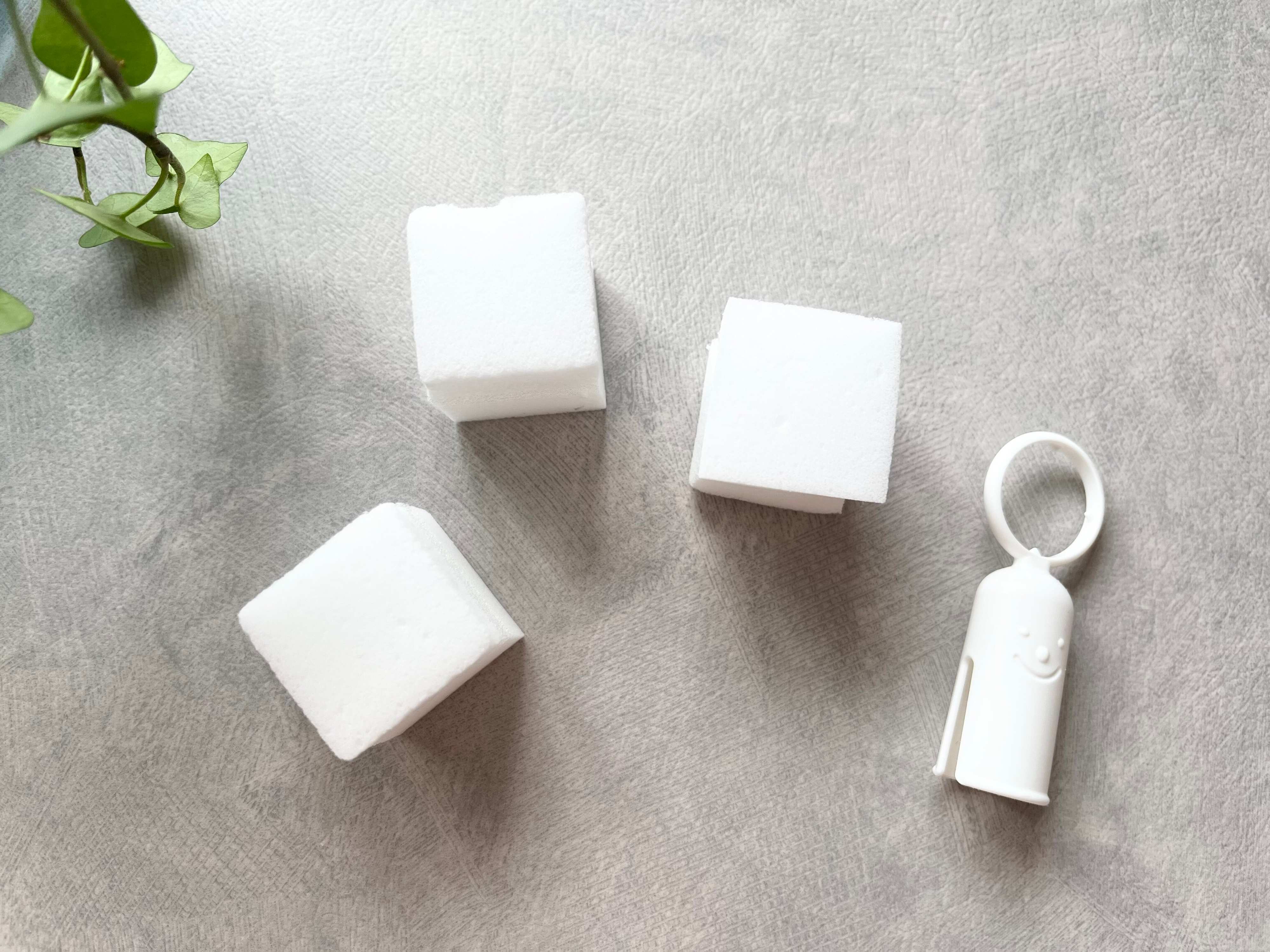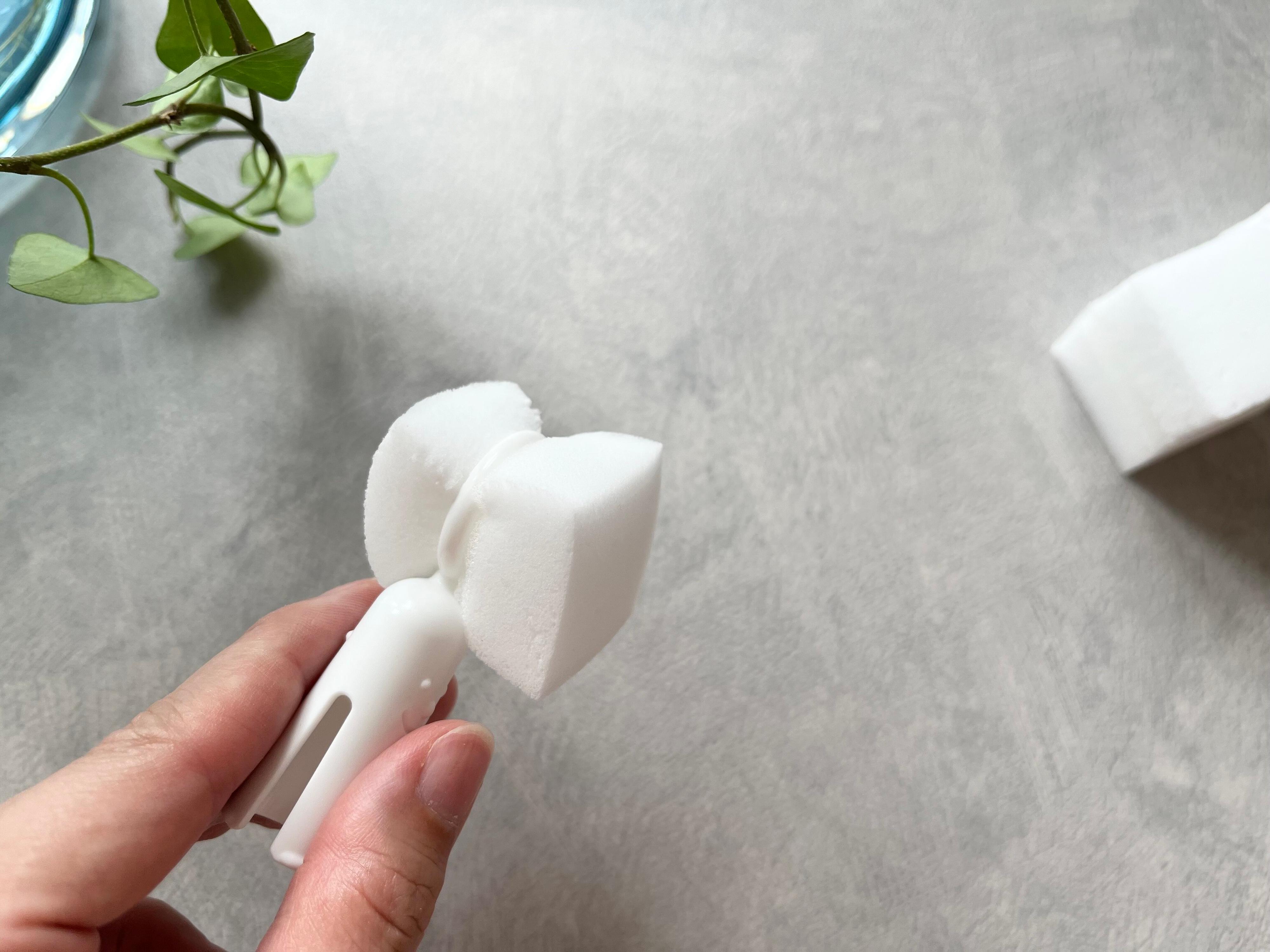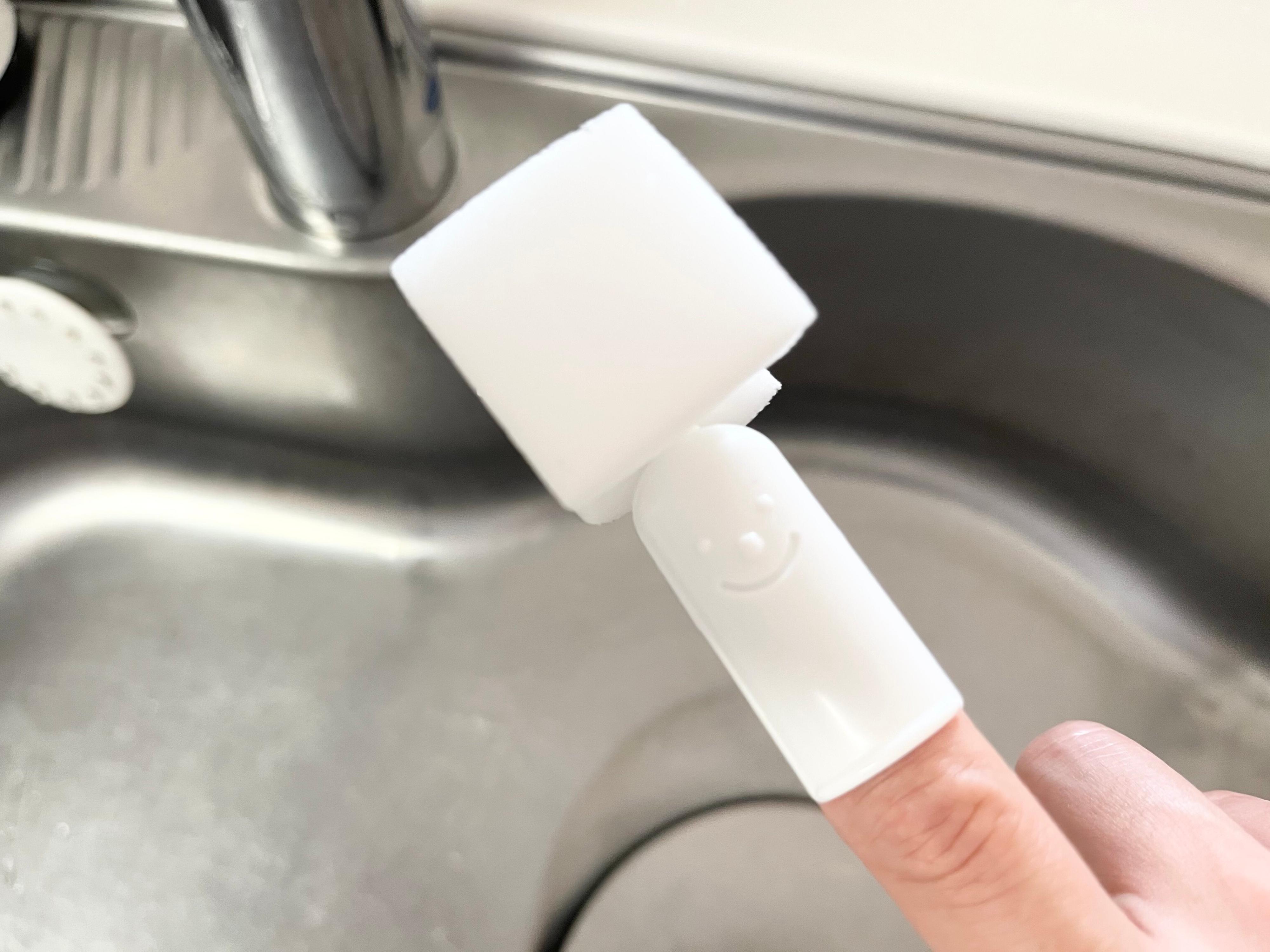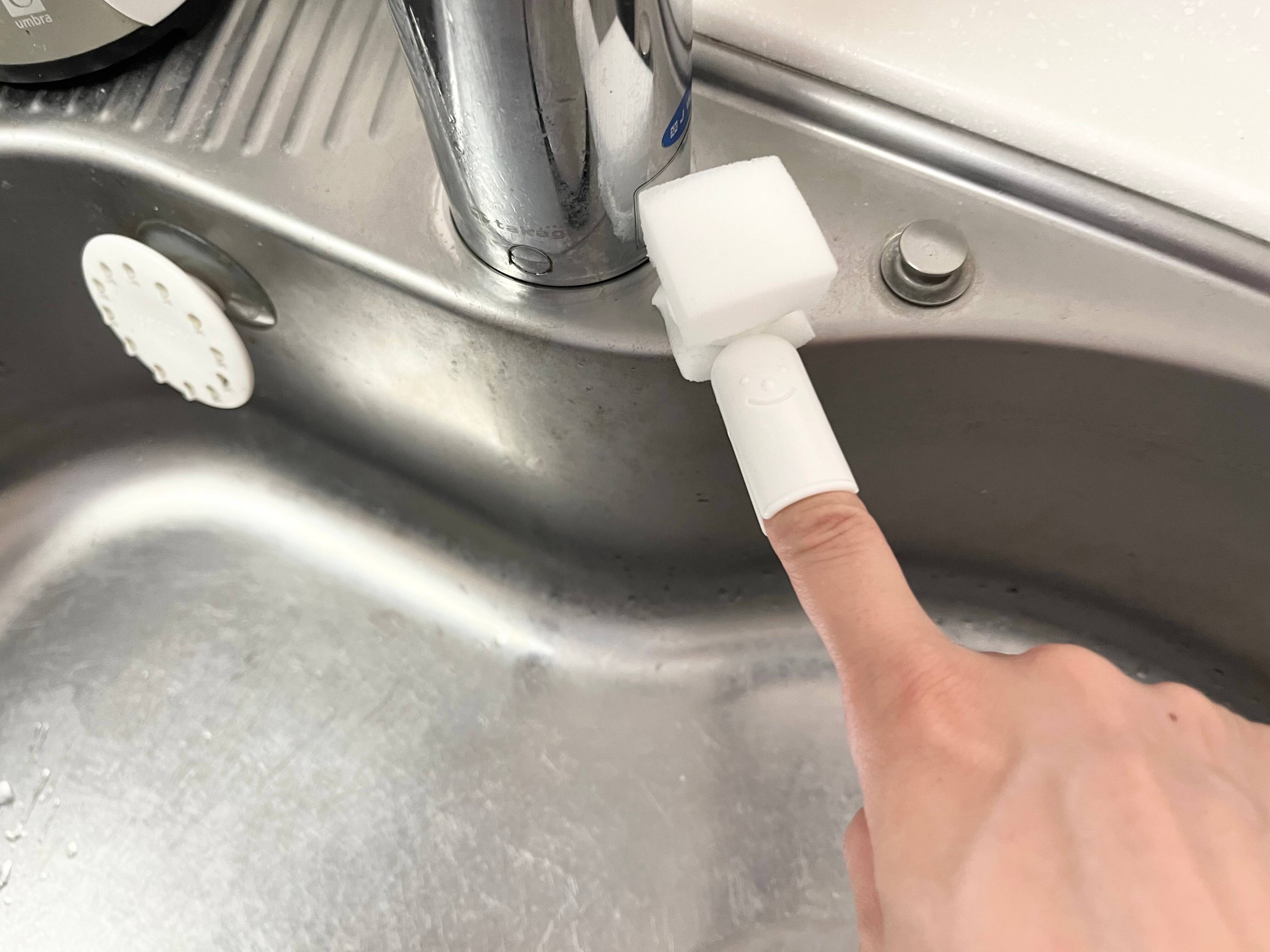 使い方は、先端のリングに付属のメラミンスポンジを取り付けて、あとは指先に差し込んで掃除をします。メラミンスポンジのサイズは、約3cm×3cm×3.5cm。小さめサイズなので、小回りも効くし細かい場所でも手軽にキュキュッと掃除をすることができます。それに水だけで水垢などの汚れを手軽に落とすことができるんですよ!