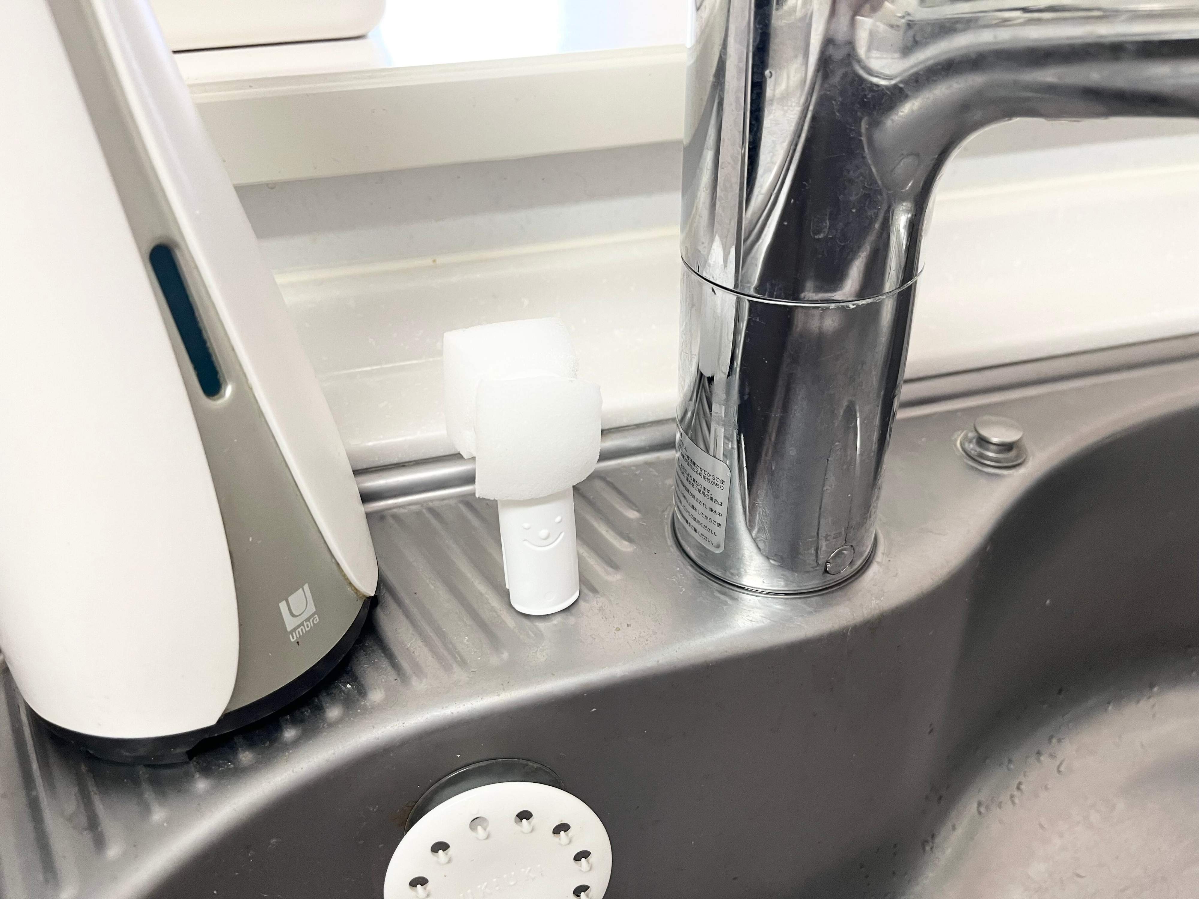 使い終わった後は、本体にメラミンスポンジを取り付けたまま立てて置くこともできます。スポンジを直置きしないでいいので、乾きやすくて衛生的なのが良いですよね。