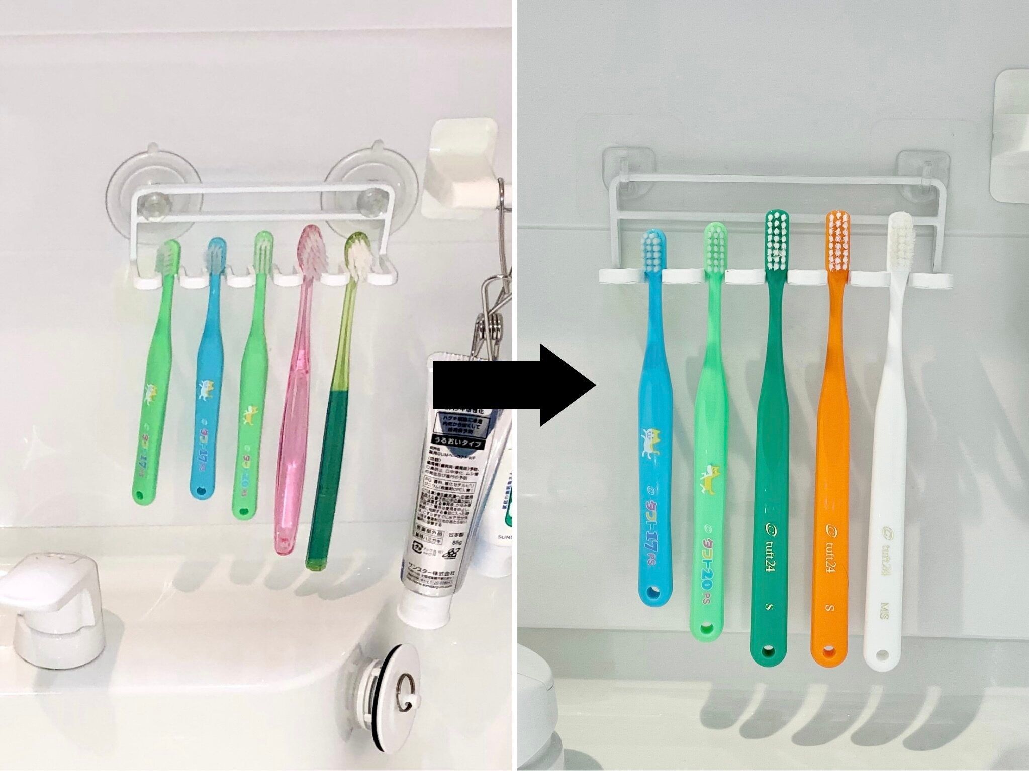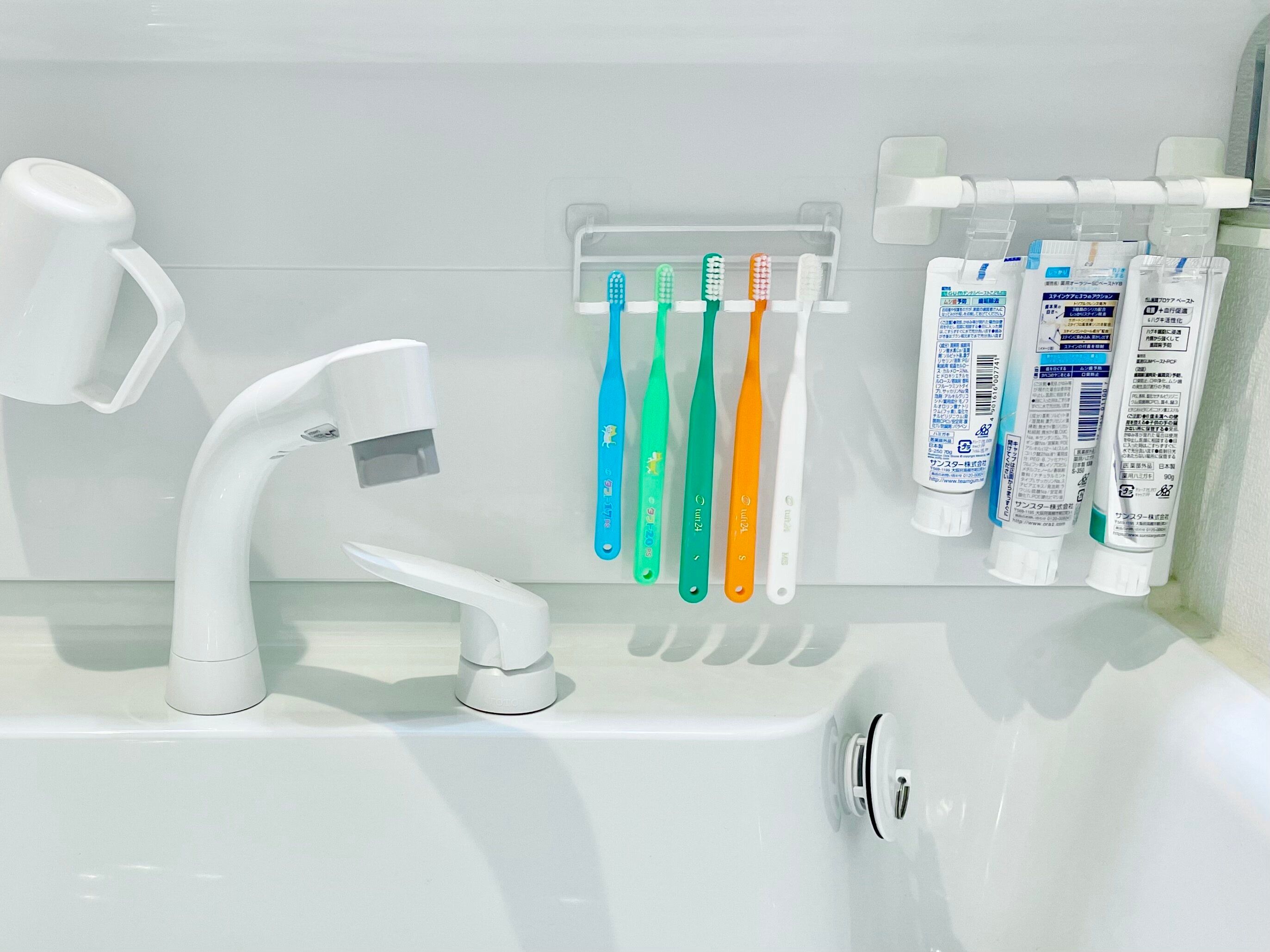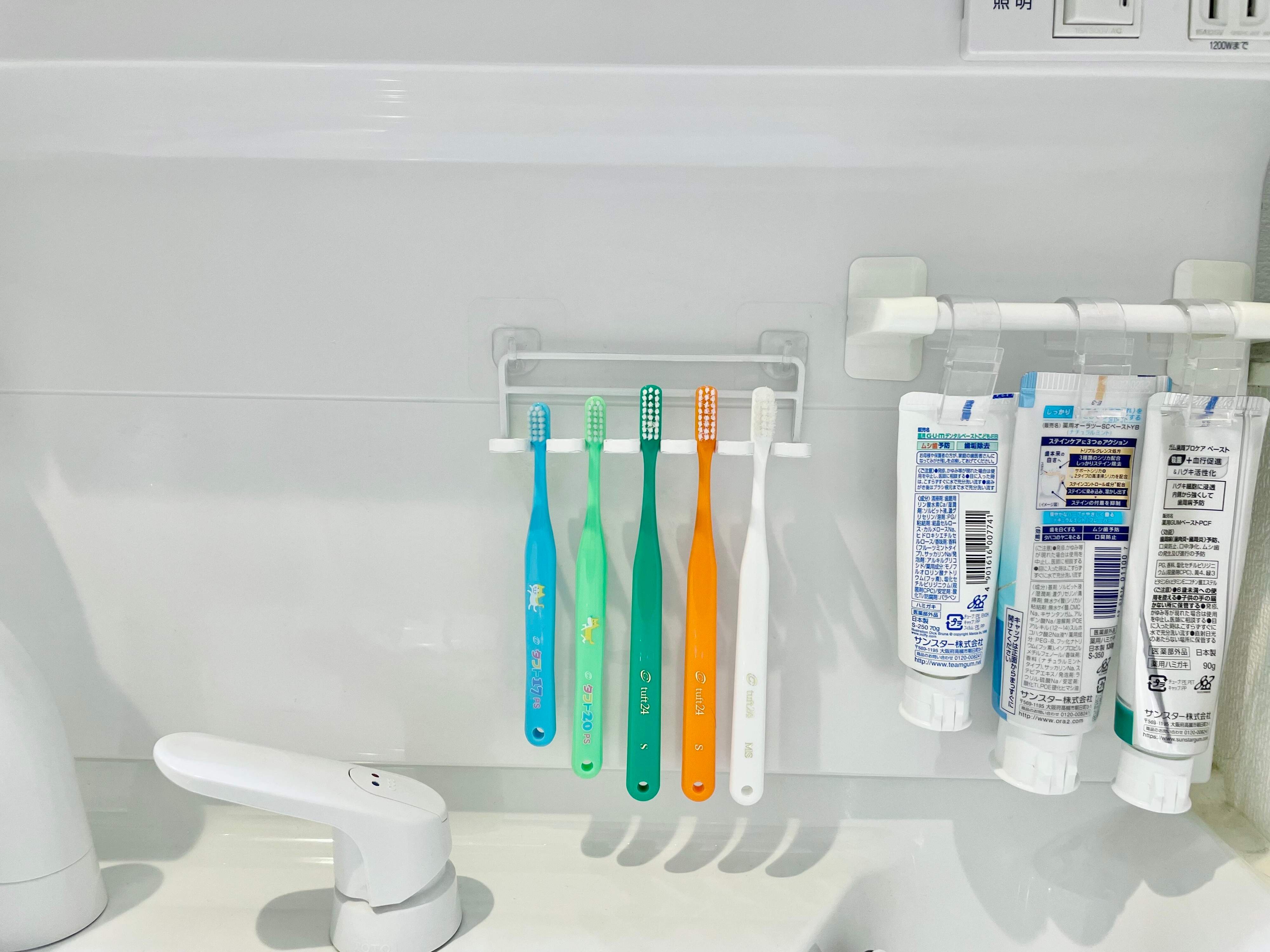 吸盤では付け外しが難しかった歯ブラシホルダーも、フックにしたことで、簡単に外せるようになりました。