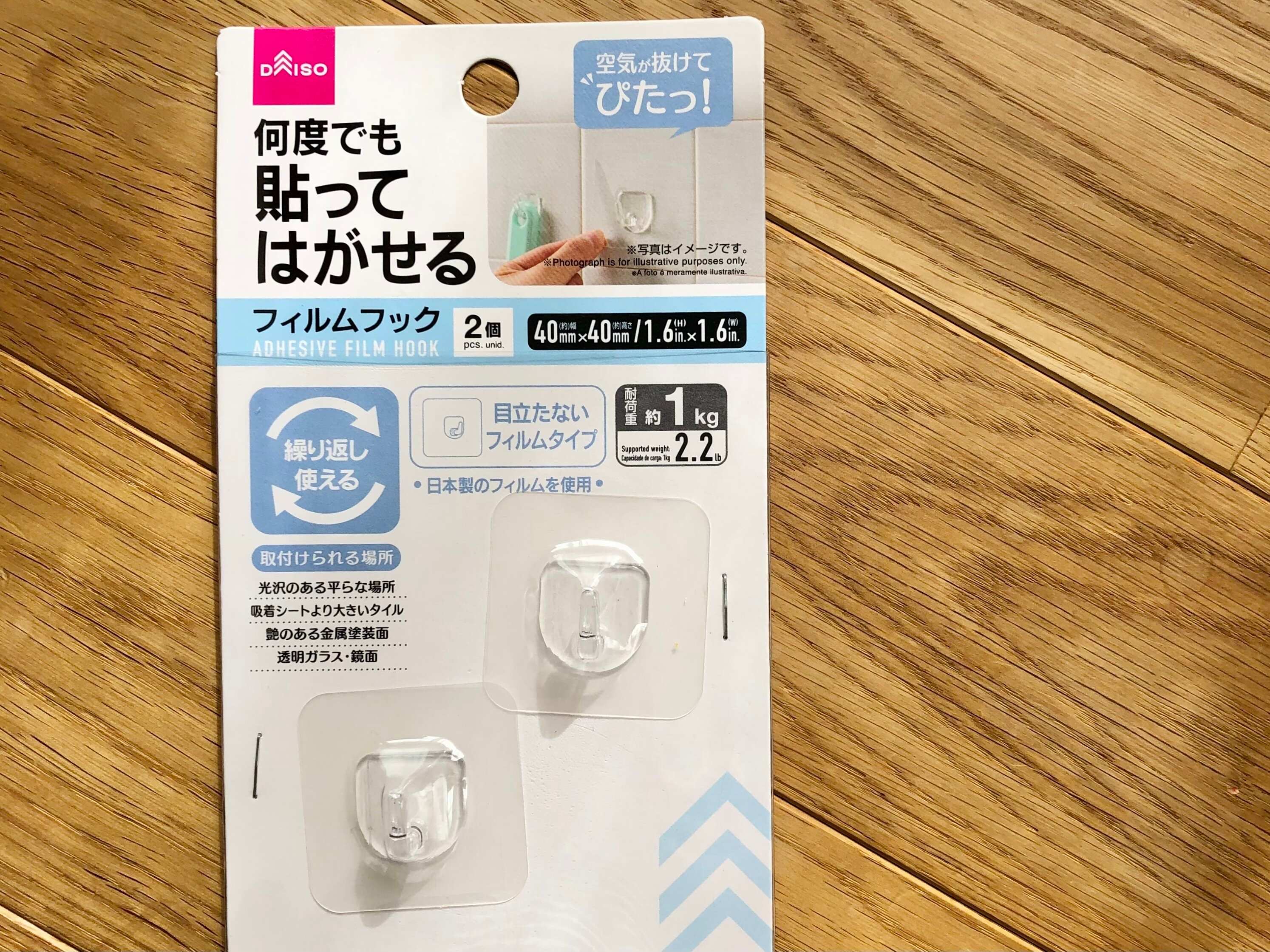 吸盤の代わりにと購入したのは、ダイソーの「何度でも貼ってはがせるフィルムフック」110円。