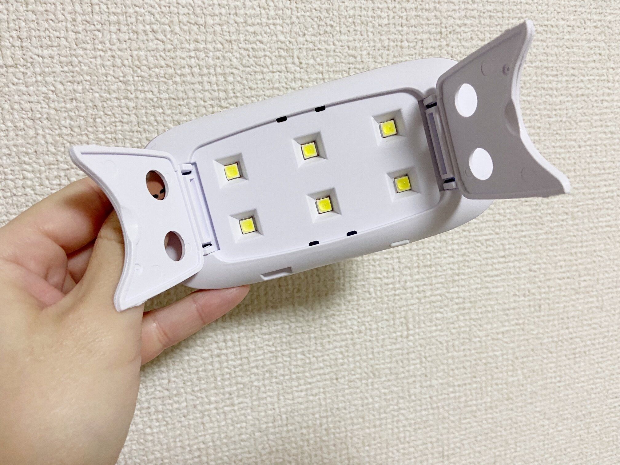 本体と専用USBケーブルがセットになっています。折りたたみ時の本体サイズは約幅13.1×奥行6.7×高さ1.9cmとコンパクトなので、収納場所に困りません。筆者が15年前に初めて購入したUV硬化ライトは小さめのプリンターくらい大きかったのでそのころと比べるとめちゃくちゃ進化しているなぁ……としみじみ。