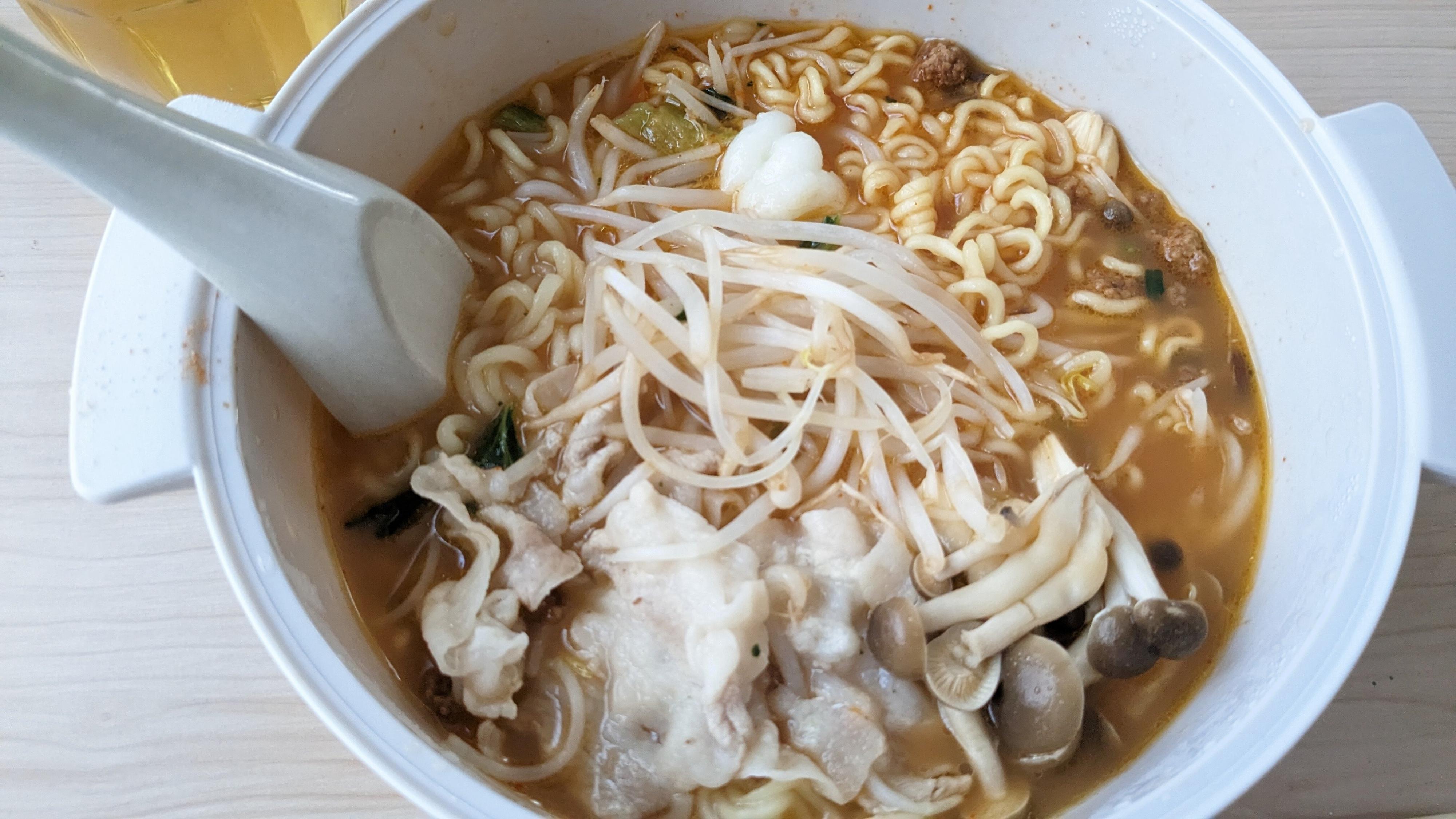 豚バラ薄切り、もやし、しめじを入れてから麺とかやくを入れました。