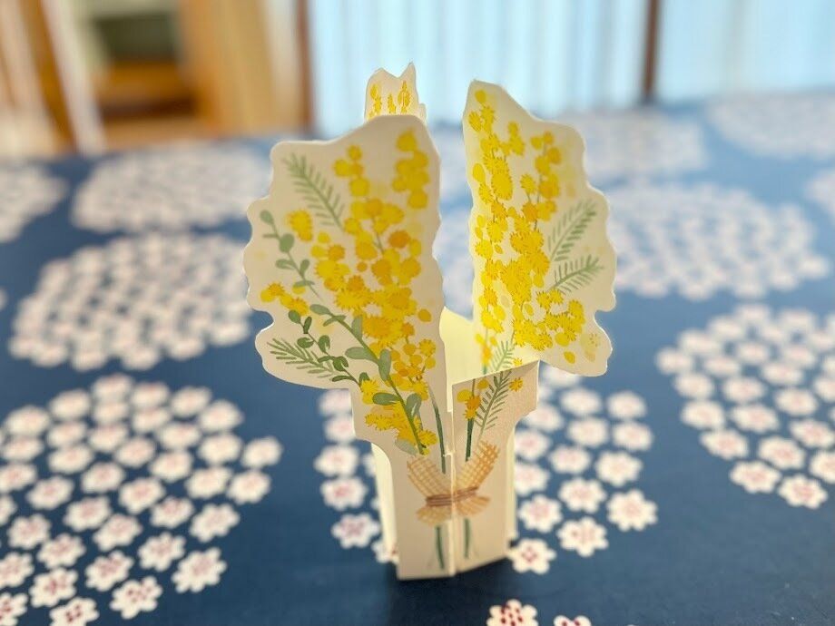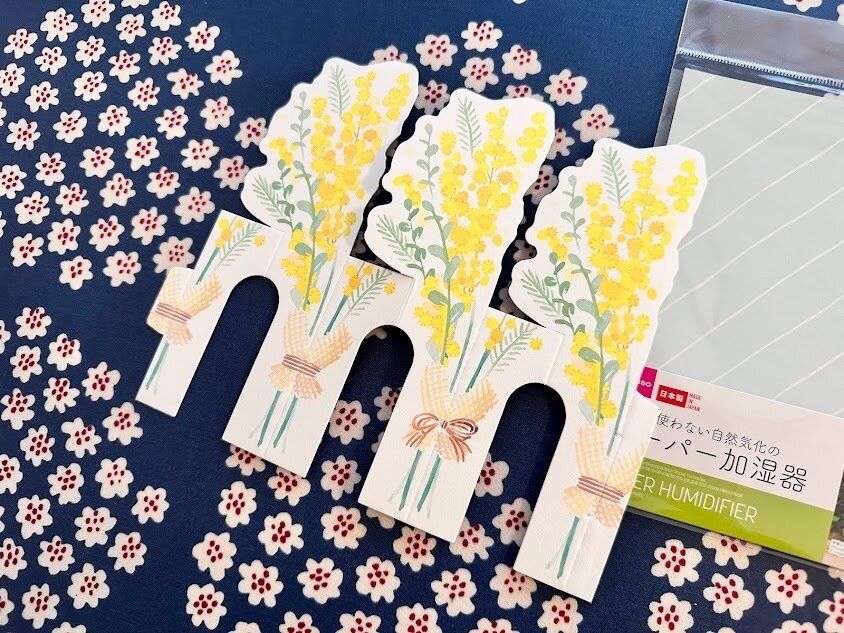 ペーパーを折り曲げて切り込み部分に突起部分を差し込むと自立してくれるようになっています。水道水を入れたお気に入りのグラスやカップに入れて、好きな場所に置くだけで気軽に加湿をプラスすることができます。かわいいミモザのイラストが、置くだけで華やかになり、さりげなくインテリアにもなってくれますよ。