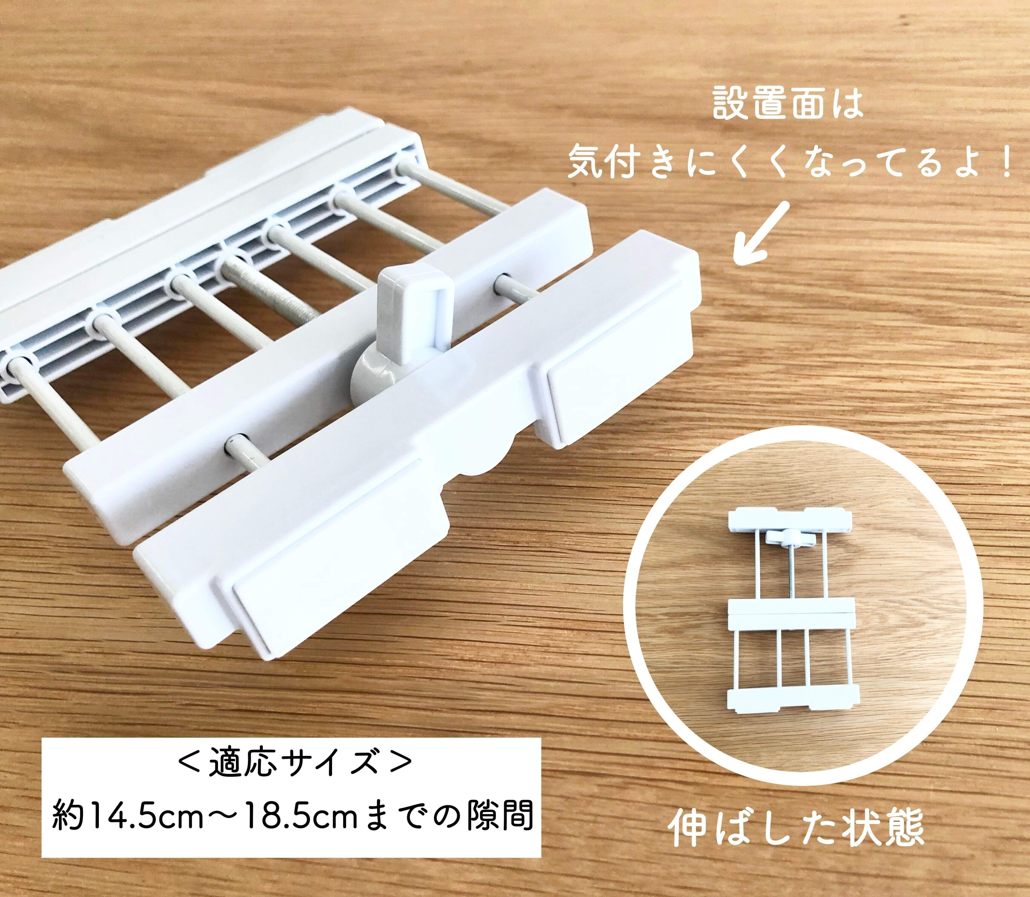 こちらの『つっぱり棚』は、約14.5cm~18.5cmまでの狭い隙間に対応した便利グッズなんですよ。