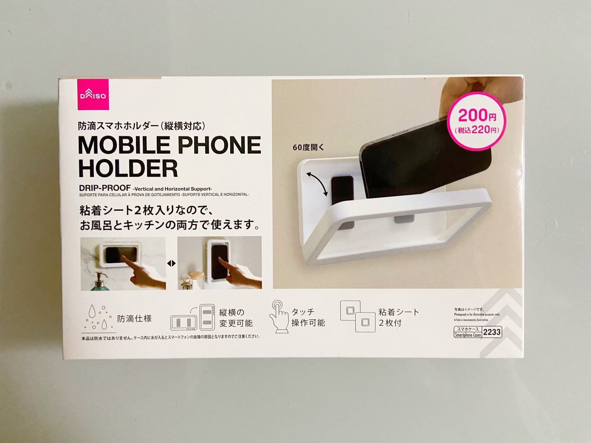 220円とプチプライスなので仕方ないのですが、ダイソーの「防滴スマホホルダー」は壁掛けのみの対応。自立しないので、置き型タイプとして使用できません。スマホを置いて使用したい人は壁やモノに立てかけないといけないので要注意!