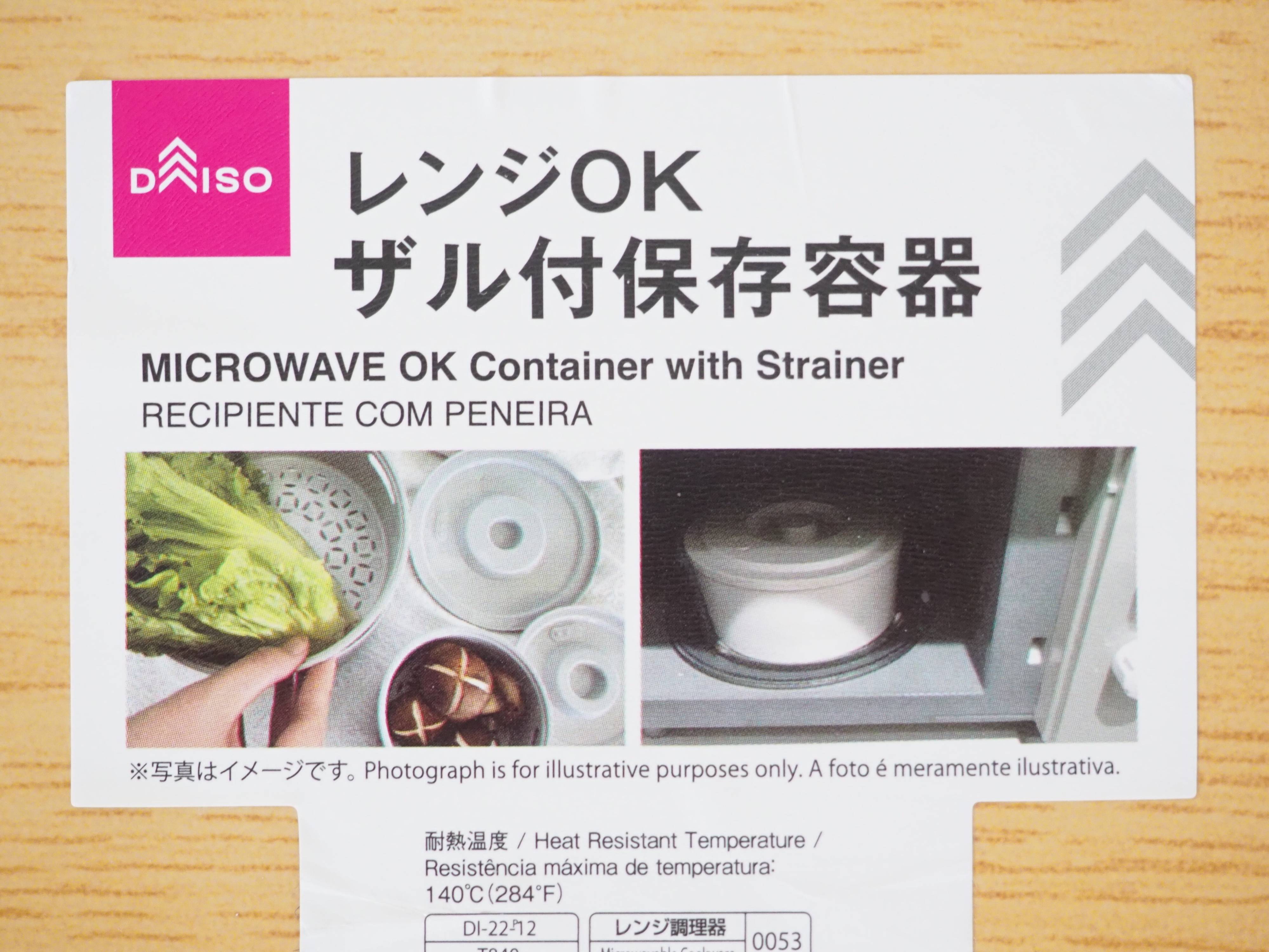 こちらが「レンジOKザル付保存容器」で、価格は110円。キッチン用品コーナーの隣に特設されていた、時短簡単電子レンジ調理器コーナーで見つけました。