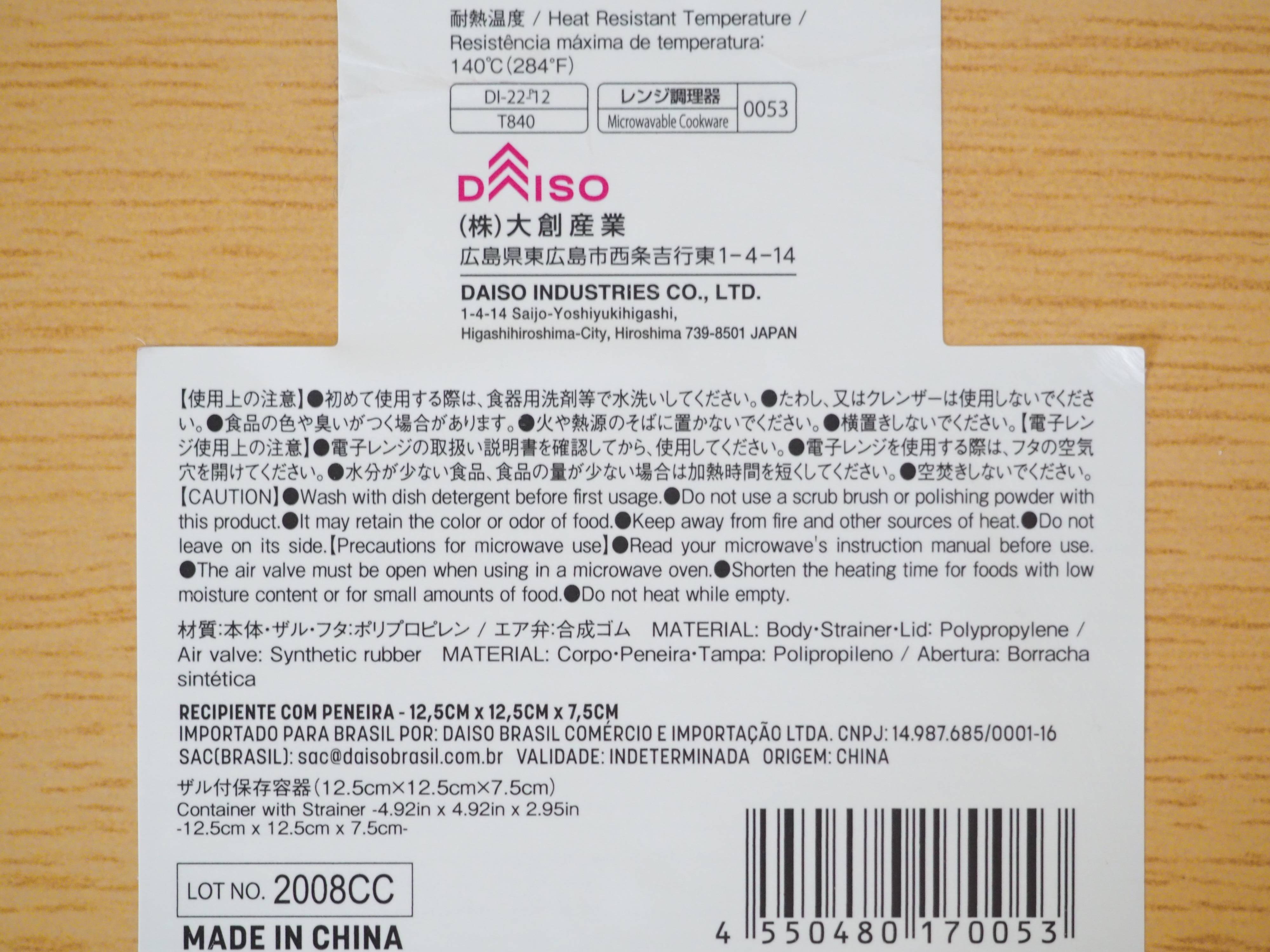 材質は本体、ザル、フタがポリプロピレン、フタに付いているエア弁が合成ゴム。耐熱温度は140度です。