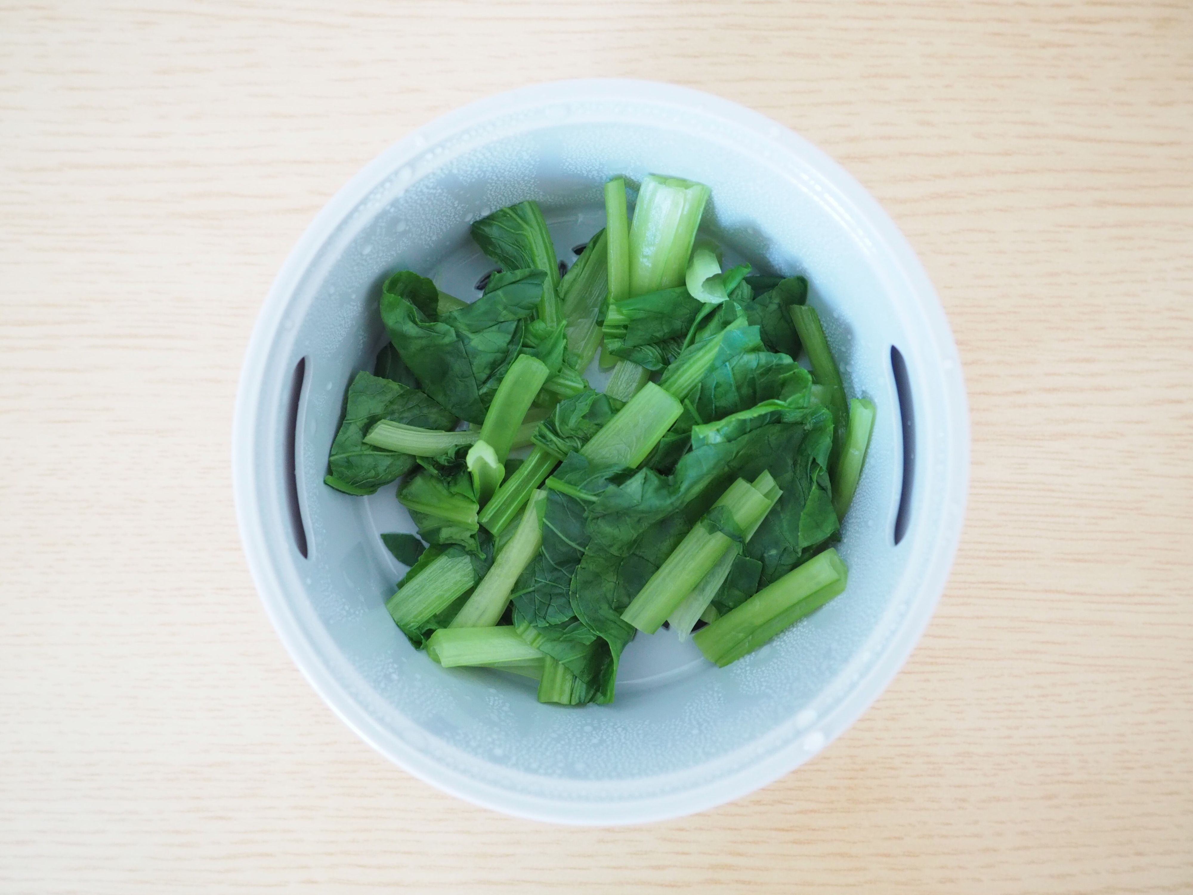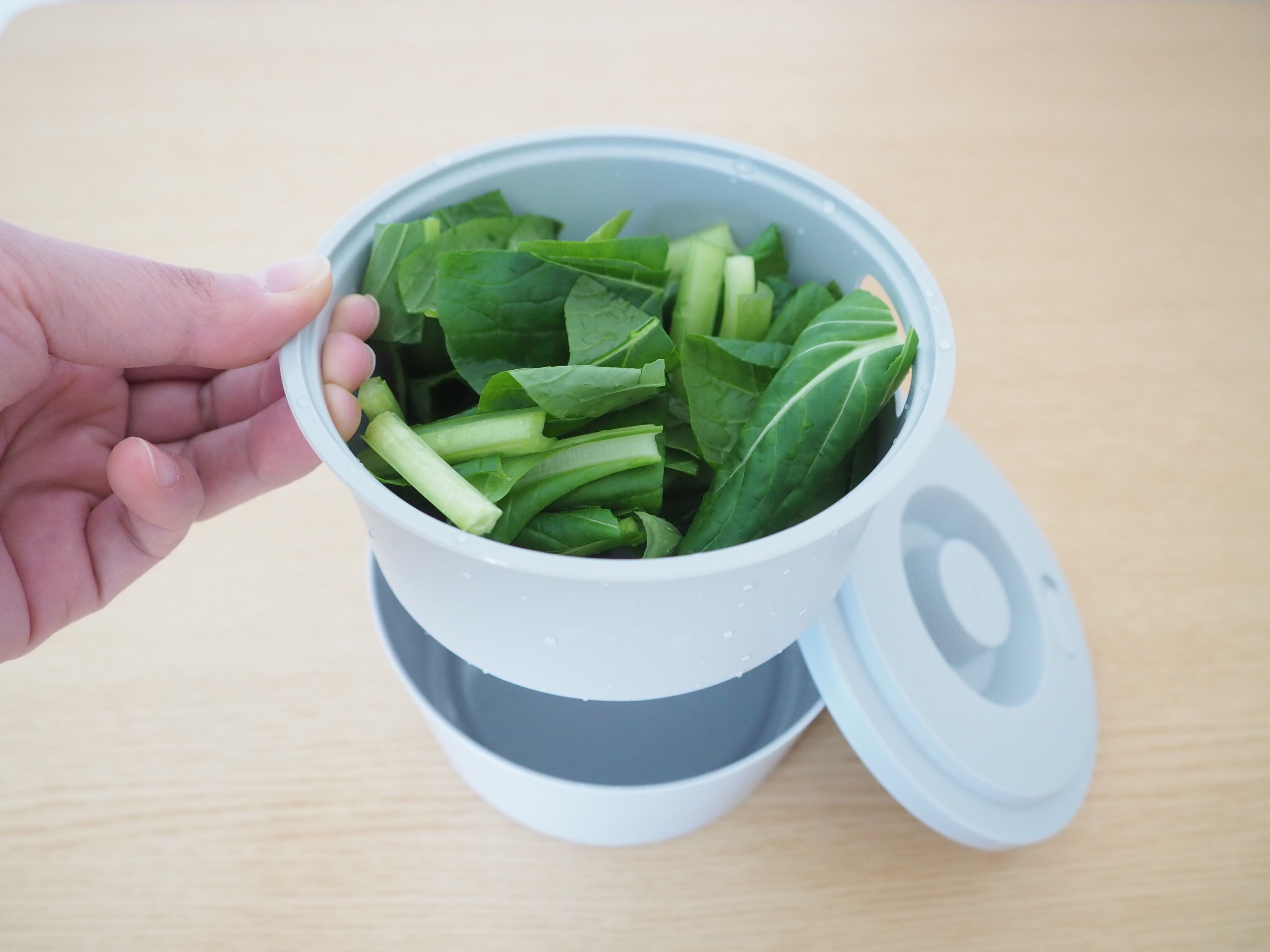 洗った小松菜をザルに入れたまま、本体にセットしてフタをします。それを電子レンジに入れて500Wで加熱。1分半後に取り出したところ、しっかり加熱されていました。このようにスチーマーのようにも使えるので、少量の副菜作りもはかどりそう!