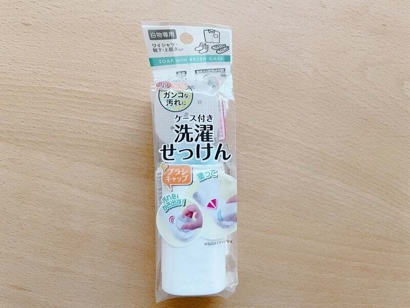 みんなが使いたい時に使えるようにと敢えてしまいこまずに出しっぱなしにしているのがセリアの「ケース付き洗濯せっけん(110円)」。こちらもリピ買いしているアイテムです。