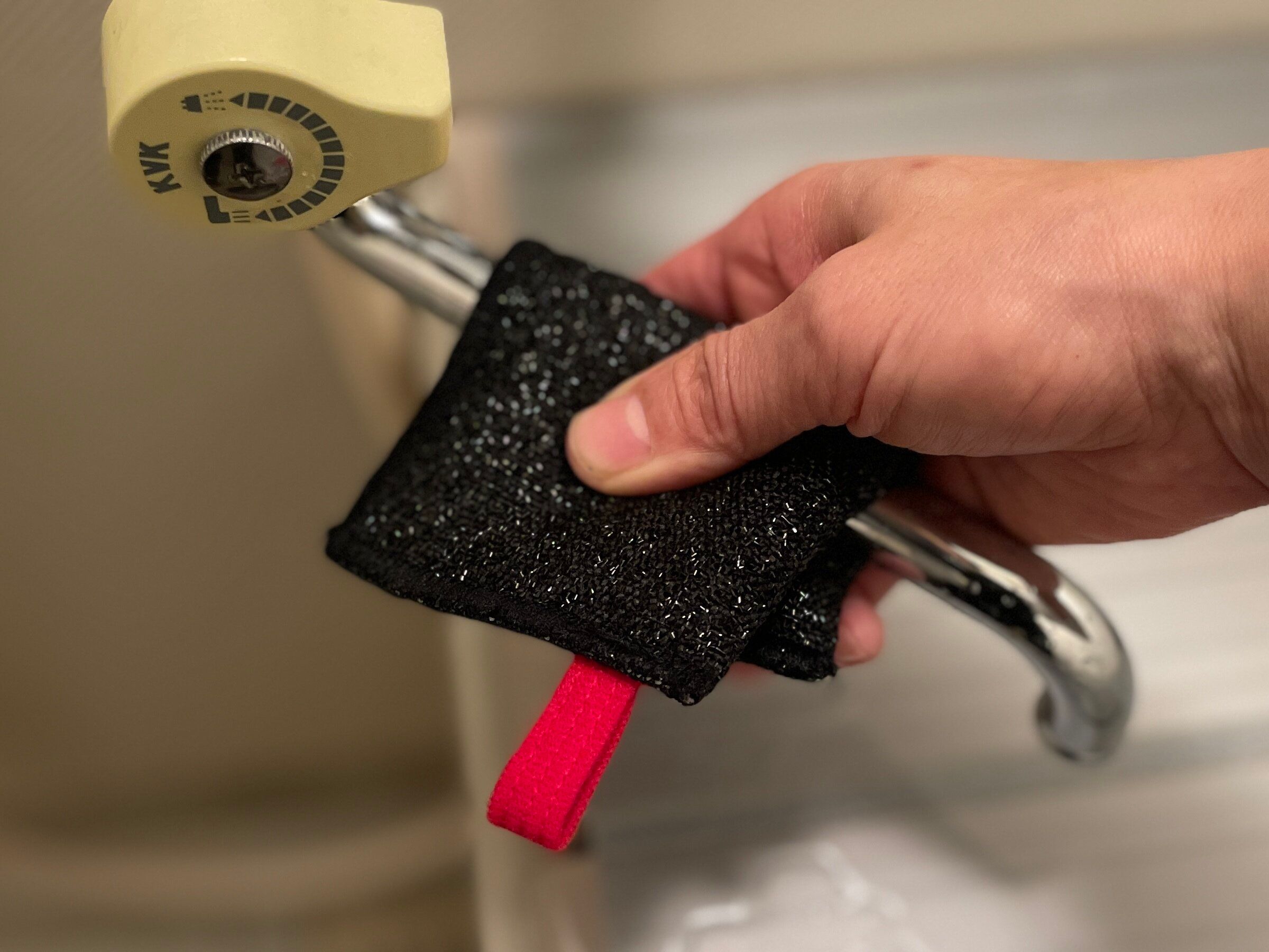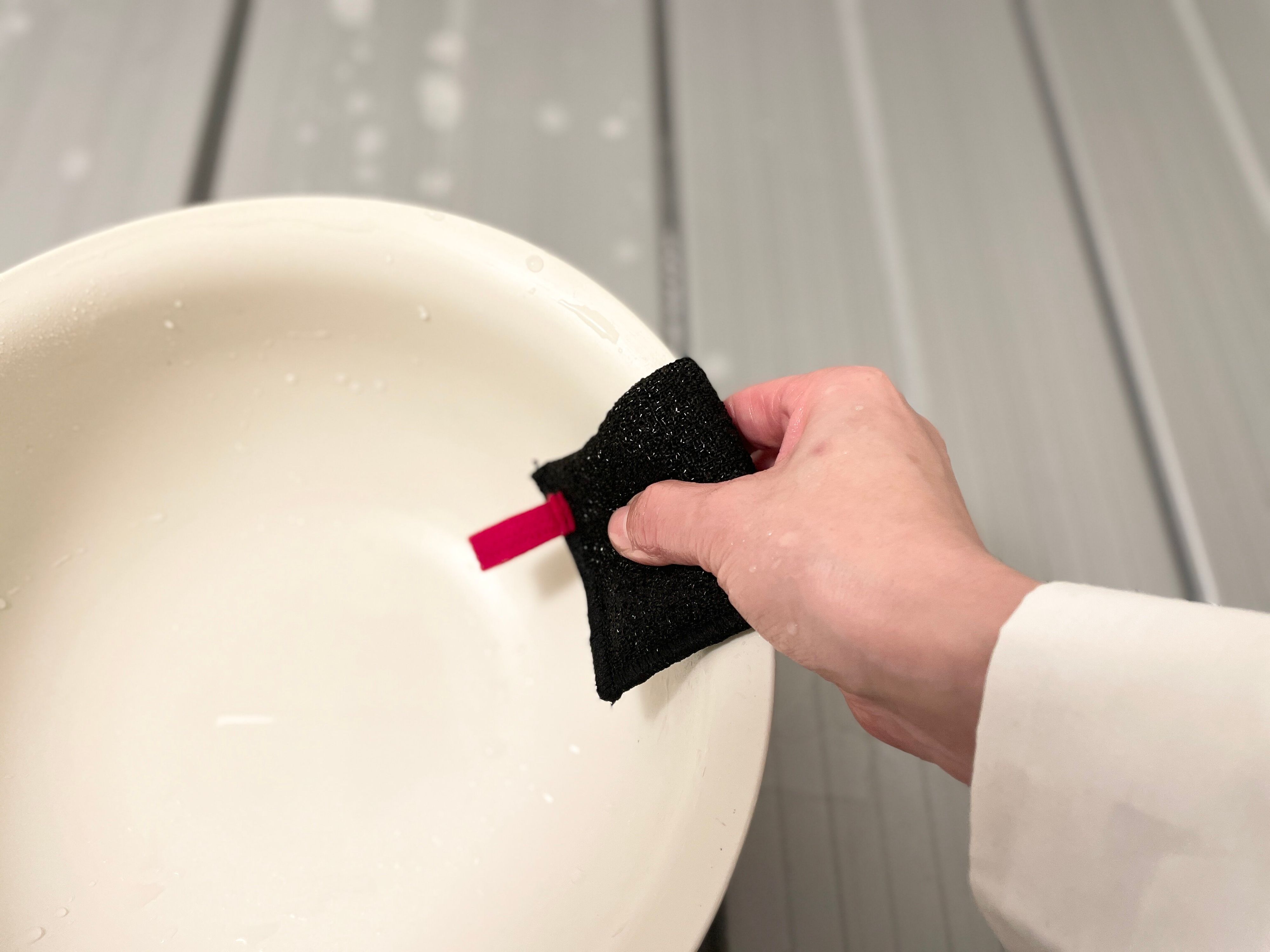 このスポンジは、真ん中が少し凹んだ形になっているので、スポンジをふたつに折り、蛇口などを挟みこんで洗えます。