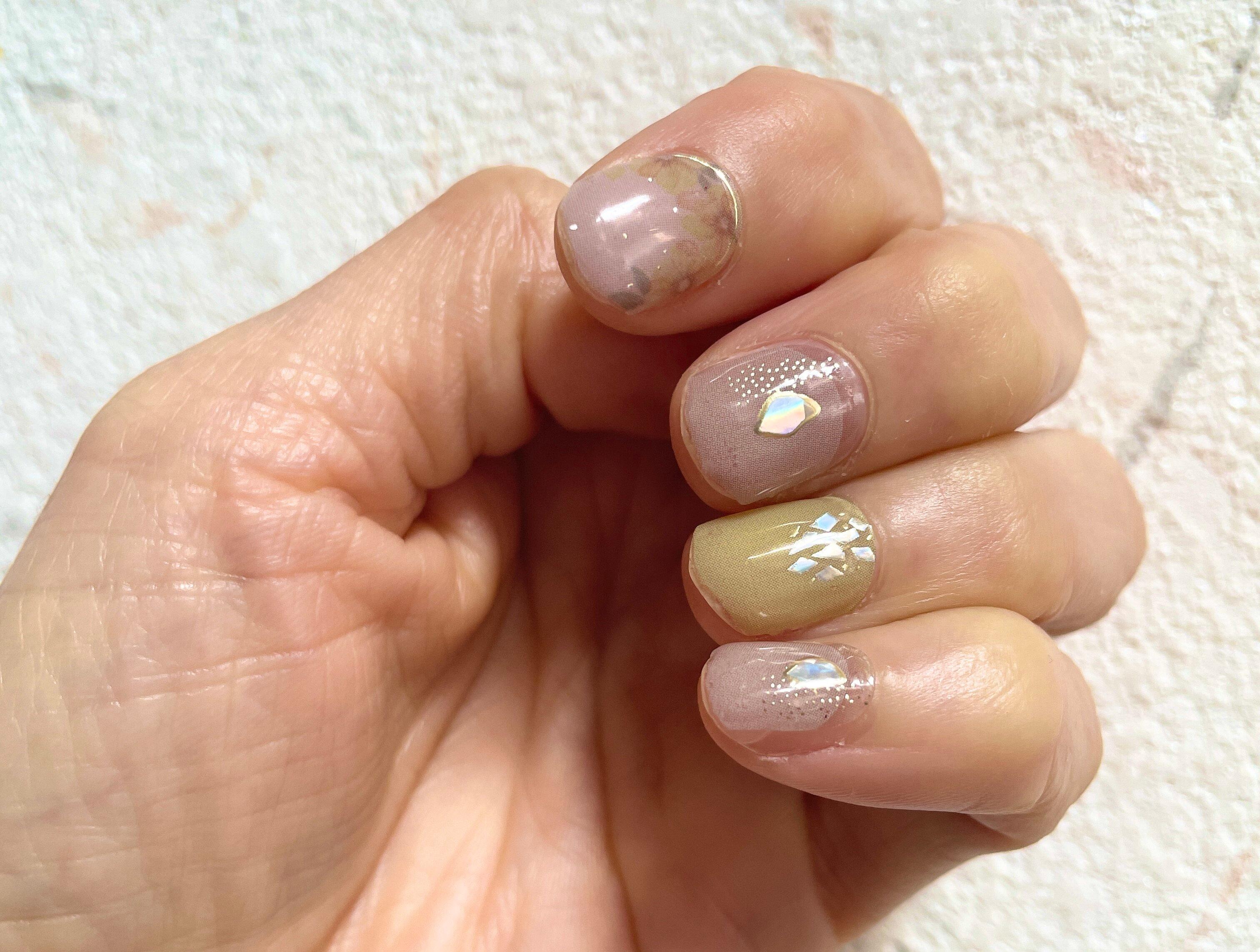 貼っただけなのに、サロンのようなアート入りネイルが簡単にできてうれしい!これは気分が上がりますね。全部違うデザインなのがまた技ありでおしゃれです。とてもセルフとは思えない出来。